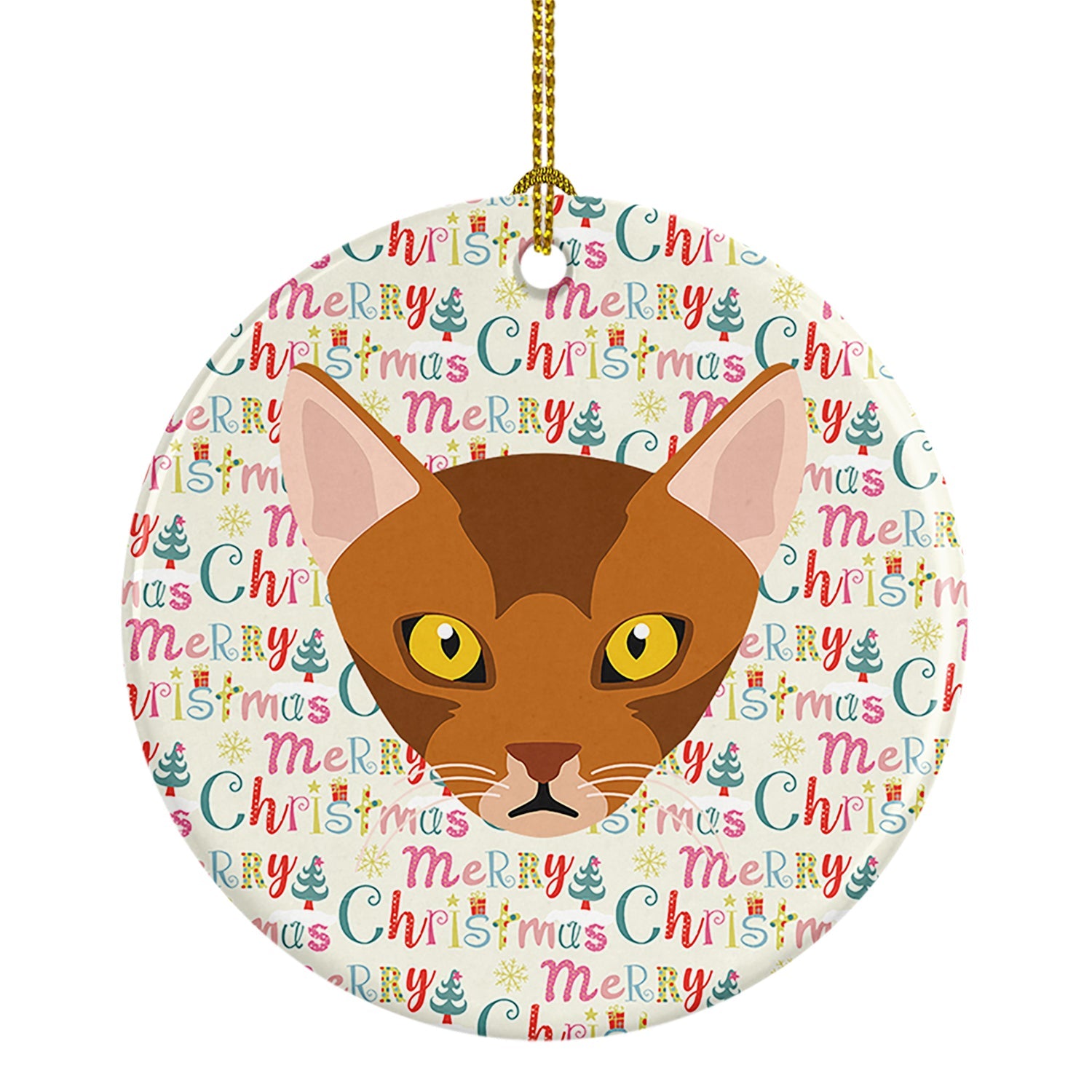 Decorate your space with our Christmas Abyssinian Cat artwork on a Ornament. Add a touch of personalized charm to your Christmas tree this holiday season with our Ceramic Ornament. Measuring 2.8125 inches in diameter, this round porcelain ornament beautifully reflects your festive lights, enhancing your holiday decor. The gloss surface sets off the vibrant, full-color artwork contributed by one of our talented artists, bringing a pop of color and joy to your tree. This Ceramic Ornament doesn't stop at being merely decorative. The white back is designed for personalization. Write a heartfelt message, mark a special year, or inscribe a date with a paint pen or a permanent marker to create a treasured memento. Please ensure you allow any personalization to dry thoroughly before handling to maintain the pristine finish. Included with the ornament is a delicate gold cord for easy hanging. Made in the USA, this Ceramic Ornament makes an exceptional gift for a pet sitter, teacher, family member, or anyone you wish to share a little Christmas magic with. With its blend of style, charm, and personal touch, it's a meaningful addition to any Christmas tree.