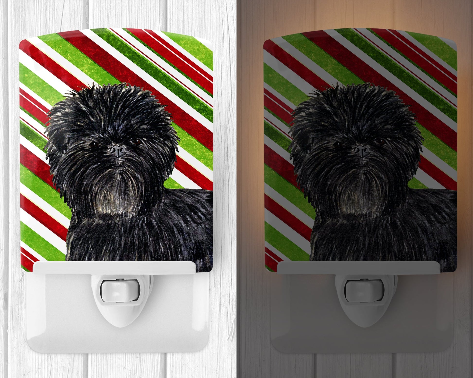 Decorate your space with our Christmas Affenpinscher artwork on a Night Light. Introduce a splash of artistic flair and subtle illumination to your space with the Decorative Ceramic Night Light from Caroline's Treasures. Perfect for any room, this night light seamlessly blends functionality with an aesthetic appeal, offering a stylish solution to brighten up dark corners of your home or office. Boasting a six-inch high by four-inch wide ceramic tile at the front, it showcases vivid, full-color artwork from distinguished artists, transforming a simple utility into a vibrant art piece. The artwork is securely encased in a robust metal holder, ensuring durability and longevity. Two screws are provided to firmly affix the tile into the holder. The holder extends three inches deep, housing an included bulb that emits a soft, welcoming glow. This product meets all safety standards, as evidenced by its UL approval. Proudly made in the United States from imported components, this Decorative Ceramic Night Light is not just a functional device; it's a statement piece that enhances the ambiance of your surroundings.