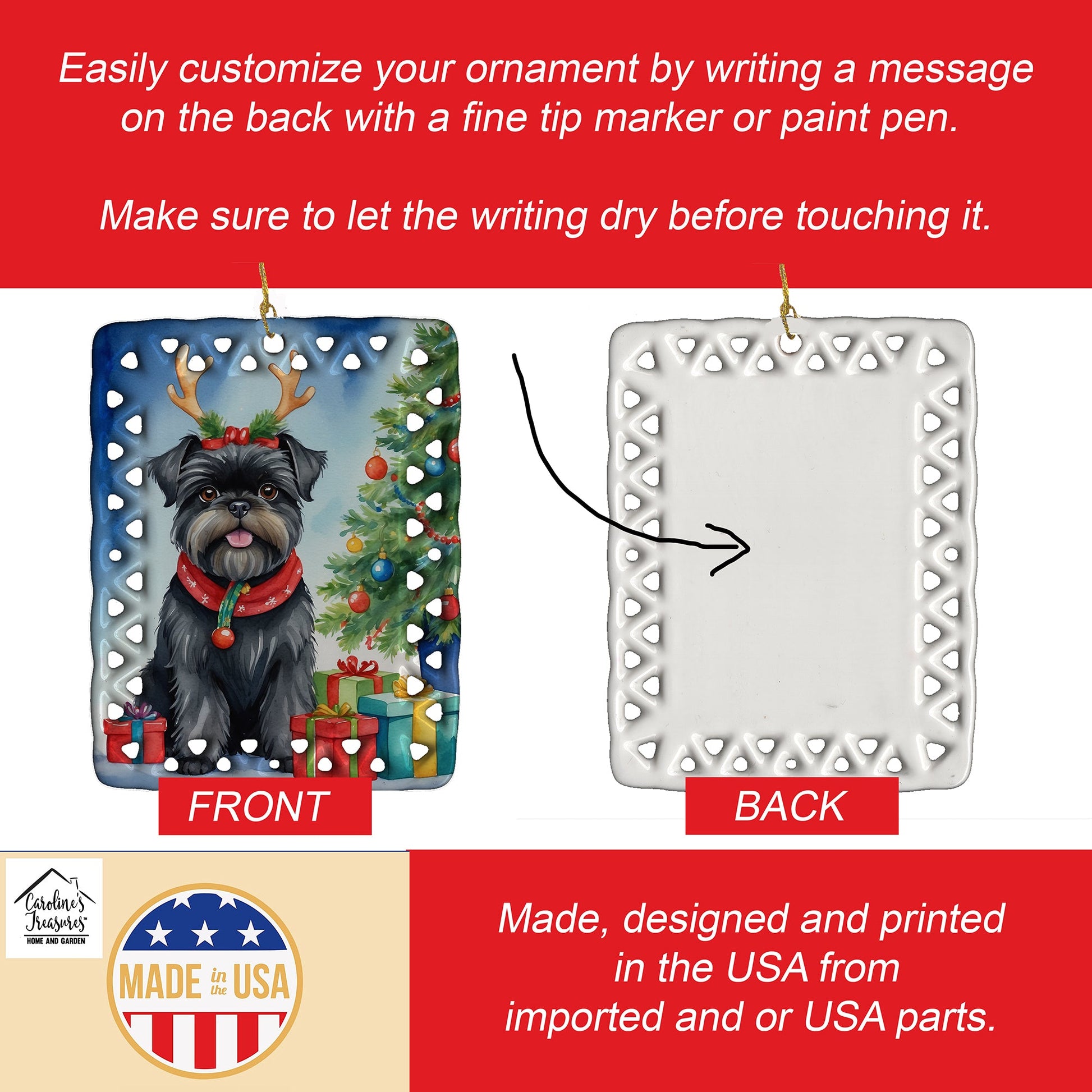 Porcelain Ornament featuring breed specific Affenpinscher artwork. Celebrate Christmas with this Christmas Ornament. Add a unique, personal touch to your holiday decor with our Rectangular Lattice Porcelain Ornament. Perfect for creating cherished memories, this high-quality ornament shines under festive lights, reflecting warmth and joy throughout your Christmas tree. Crafted with a glossy finish, it showcases vibrant, full-color artwork contributed by our talented artists, ensuring your tree is adorned with a burst of color and holiday spirit. What sets this Porcelain Ornament apart is its customizable white back. Use a paint pen or permanent marker to write a heartfelt message, commemorate a special year, or mark an unforgettable date, turning this ornament into a keepsake that will be treasured for years to come. For best results, allow any personalization to dry thoroughly before handling. Each ornament comes complete with a delicate gold cord, making it easy to hang and display. Proudly made in the USA, this ornament measures 3.375 x 2.625 inches and is a thoughtful gift for pet sitters, teachers, family members, or anyone who would appreciate a little extra holiday magic. Bring style, charm, and a touch of personal meaning to your Christmas tree with this beautifully designed ornament..