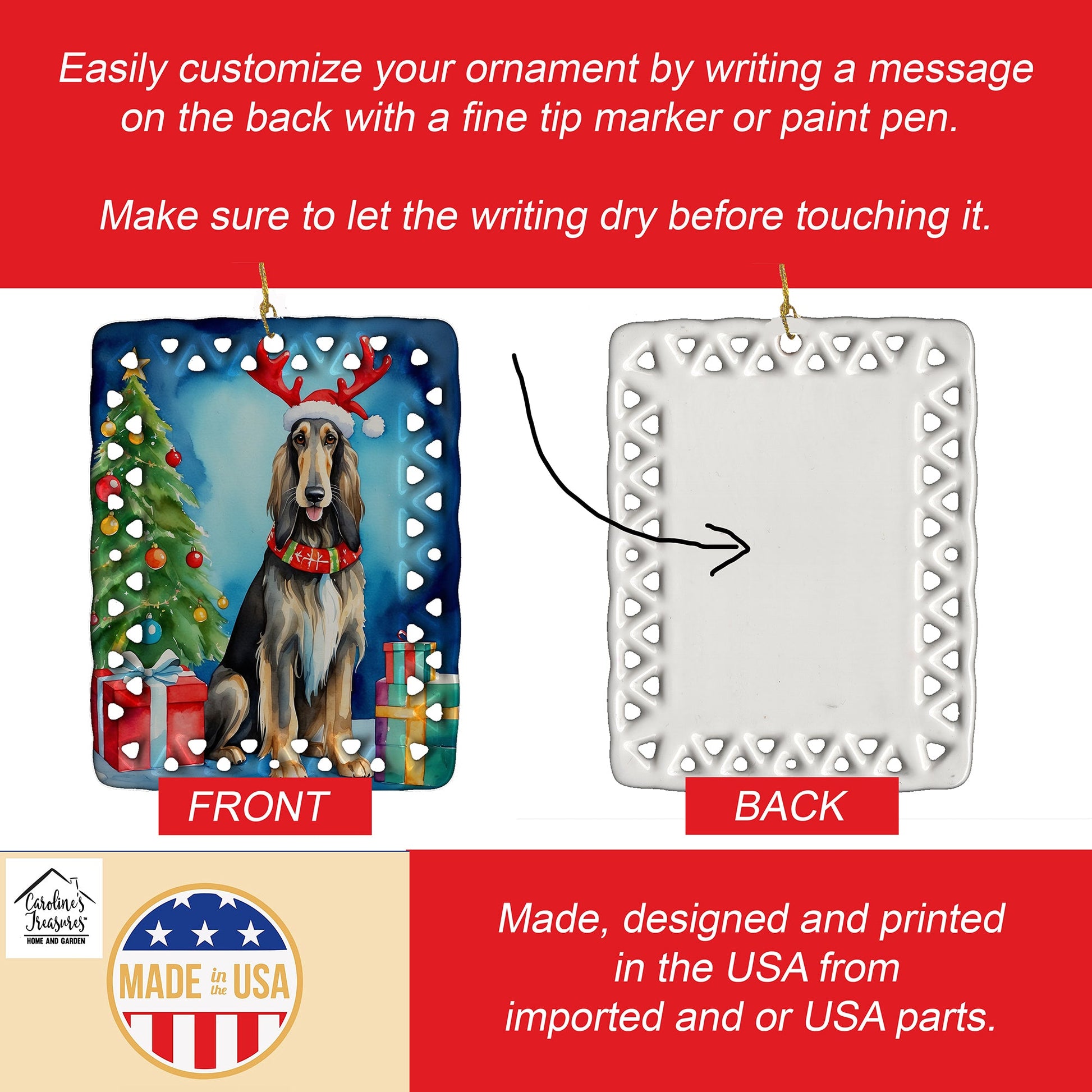 Porcelain Ornament featuring breed specific Afghan Hound artwork. Celebrate Christmas with this Christmas Ornament. Add a unique, personal touch to your holiday decor with our Rectangular Lattice Porcelain Ornament. Perfect for creating cherished memories, this high-quality ornament shines under festive lights, reflecting warmth and joy throughout your Christmas tree. Crafted with a glossy finish, it showcases vibrant, full-color artwork contributed by our talented artists, ensuring your tree is adorned with a burst of color and holiday spirit. What sets this Porcelain Ornament apart is its customizable white back. Use a paint pen or permanent marker to write a heartfelt message, commemorate a special year, or mark an unforgettable date, turning this ornament into a keepsake that will be treasured for years to come. For best results, allow any personalization to dry thoroughly before handling. Each ornament comes complete with a delicate gold cord, making it easy to hang and display. Proudly made in the USA, this ornament measures 3.375 x 2.625 inches and is a thoughtful gift for pet sitters, teachers, family members, or anyone who would appreciate a little extra holiday magic. Bring style, charm, and a touch of personal meaning to your Christmas tree with this beautifully designed ornament..