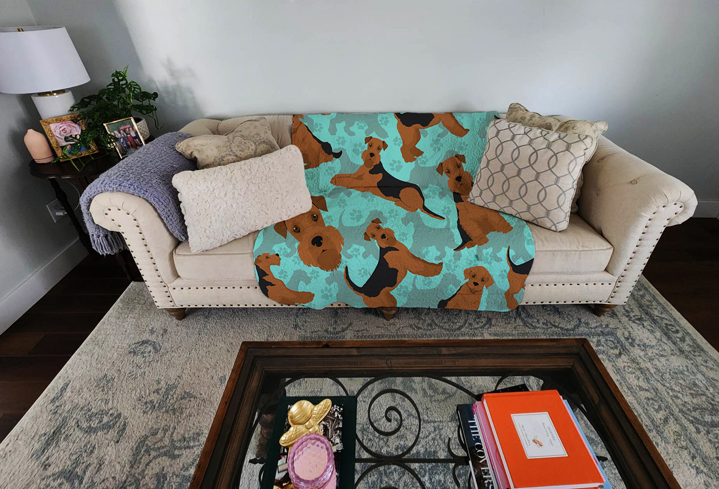 Decorate your space with our  Airedale Terrier artwork on a . Our quilted throw blanket is a must-have for anyone who values Form as well as Function! It measures 50 inches by 60 inches and is trimmed with a whip stitch.  This heavier blanket is sure to keep away any draft or breeze without causing you to overheat. Use it as an accent piece for furniture, wrap your child in its comforting warmth, keep your pet calm on visits to the vet's office, or use it as an extra layer of softness for any crib or kennel. Here at Caroline's Treasures, we know that some dogs love to share sleeping accommodations with their favorite humans; This blanket makes a great coverlet for the foot of your bed so your four-legged companion has a warm, soft area to snooze on all night without getting your bedding dirty over time. When the blanket does get too many pawprints on it, simply throw it in the wash and follow the care instructions on the tag to restore it to like-new condition. This blanket is made of 67% Polyester and 33% Cotton to ensure durability and comfort. Filled with 100% Cotton and quilted, it does an excellent job at keeping the chill at bay.