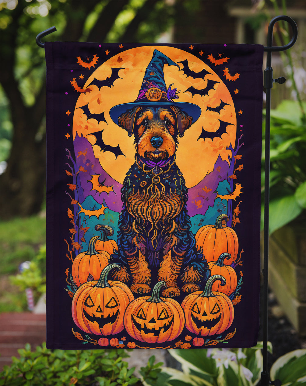 Airedale Terrier Witchy Halloween Garden Flag – Witch Dog with Pumpkins, Bats & Jack-o'-Lanterns