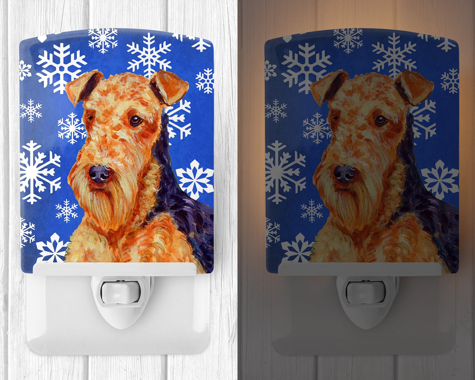 Decorate your space with our Christmas Airedale Terrier artwork on a Night Light. Bring a bit of Winter into your home with a Winter Night Light. Introduce a splash of artistic flair and subtle illumination to your space with the Decorative Ceramic Night Light from Caroline's Treasures. Perfect for any room, this night light seamlessly blends functionality with an aesthetic appeal, offering a stylish solution to brighten up dark corners of your home or office. Boasting a six-inch high by four-inch wide ceramic tile at the front, it showcases vivid, full-color artwork from distinguished artists, transforming a simple utility into a vibrant art piece. The artwork is securely encased in a robust metal holder, ensuring durability and longevity. Two screws are provided to firmly affix the tile into the holder. The holder extends three inches deep, housing an included bulb that emits a soft, welcoming glow. This product meets all safety standards, as evidenced by its UL approval. Proudly made in the United States from imported components, this Decorative Ceramic Night Light is not just a functional device; it's a statement piece that enhances the ambiance of your surroundings.