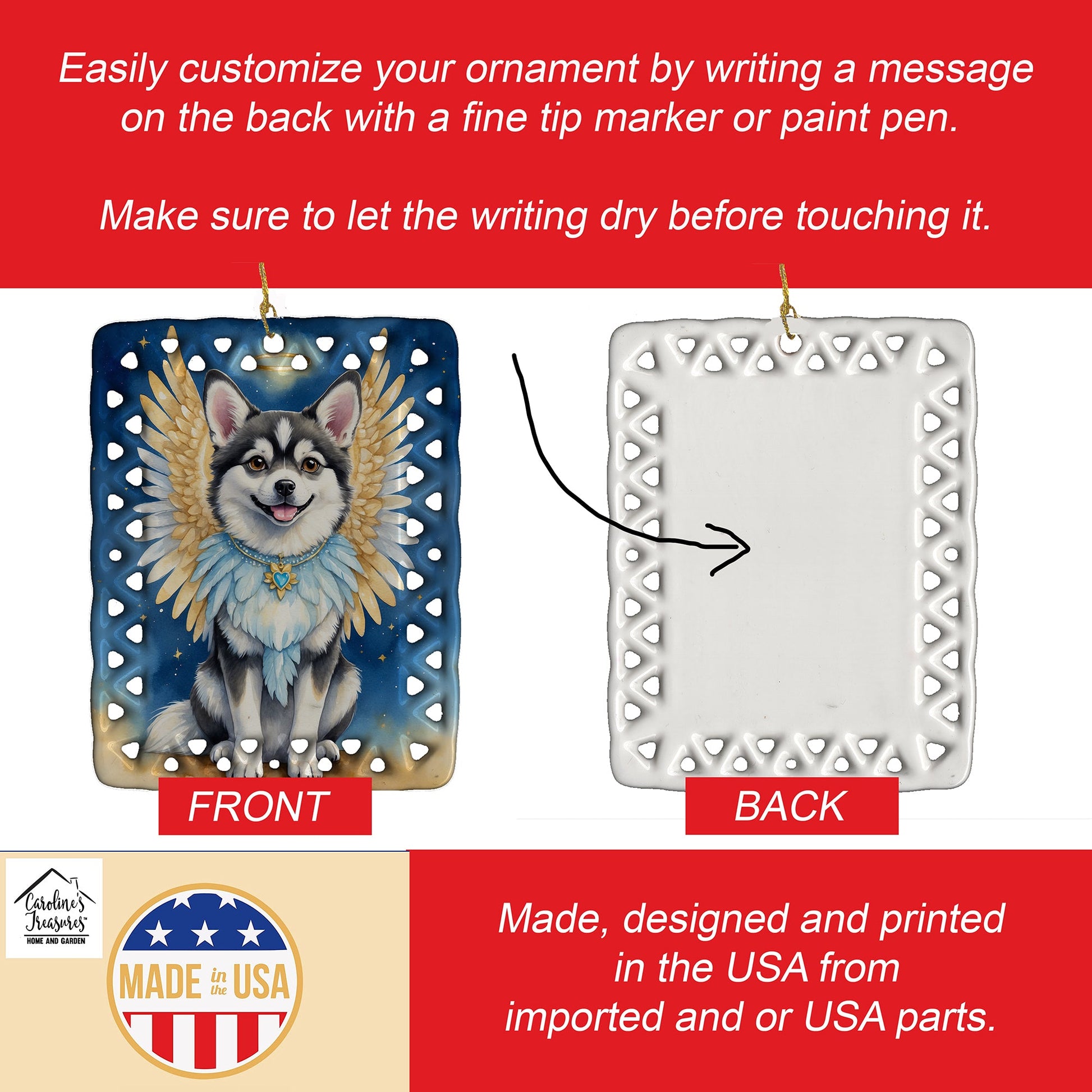 Porcelain Ornament featuring breed specific Alaskan Klee Kai artwork. Celebrate Christmas with this Christmas Ornament. Add a unique, personal touch to your holiday decor with our Rectangular Lattice Porcelain Ornament. Perfect for creating cherished memories, this high-quality ornament shines under festive lights, reflecting warmth and joy throughout your Christmas tree. Crafted with a glossy finish, it showcases vibrant, full-color artwork contributed by our talented artists, ensuring your tree is adorned with a burst of color and holiday spirit. What sets this Porcelain Ornament apart is its customizable white back. Use a paint pen or permanent marker to write a heartfelt message, commemorate a special year, or mark an unforgettable date, turning this ornament into a keepsake that will be treasured for years to come. For best results, allow any personalization to dry thoroughly before handling. Each ornament comes complete with a delicate gold cord, making it easy to hang and display. Proudly made in the USA, this ornament measures 3.375 x 2.625 inches and is a thoughtful gift for pet sitters, teachers, family members, or anyone who would appreciate a little extra holiday magic. Bring style, charm, and a touch of personal meaning to your Christmas tree with this beautifully designed ornament..