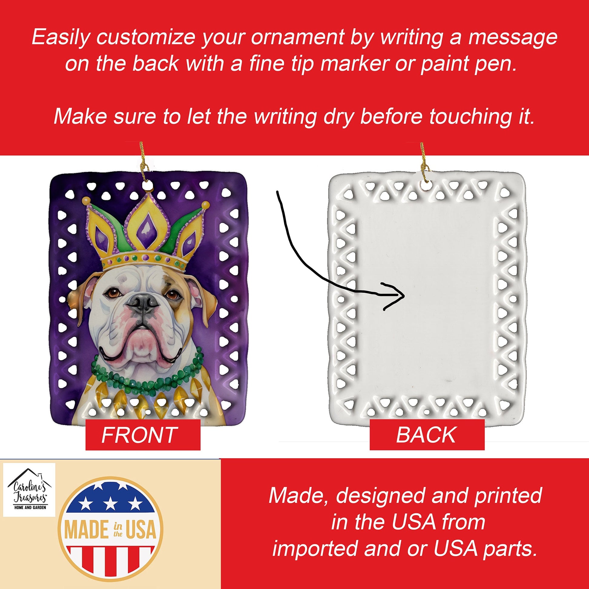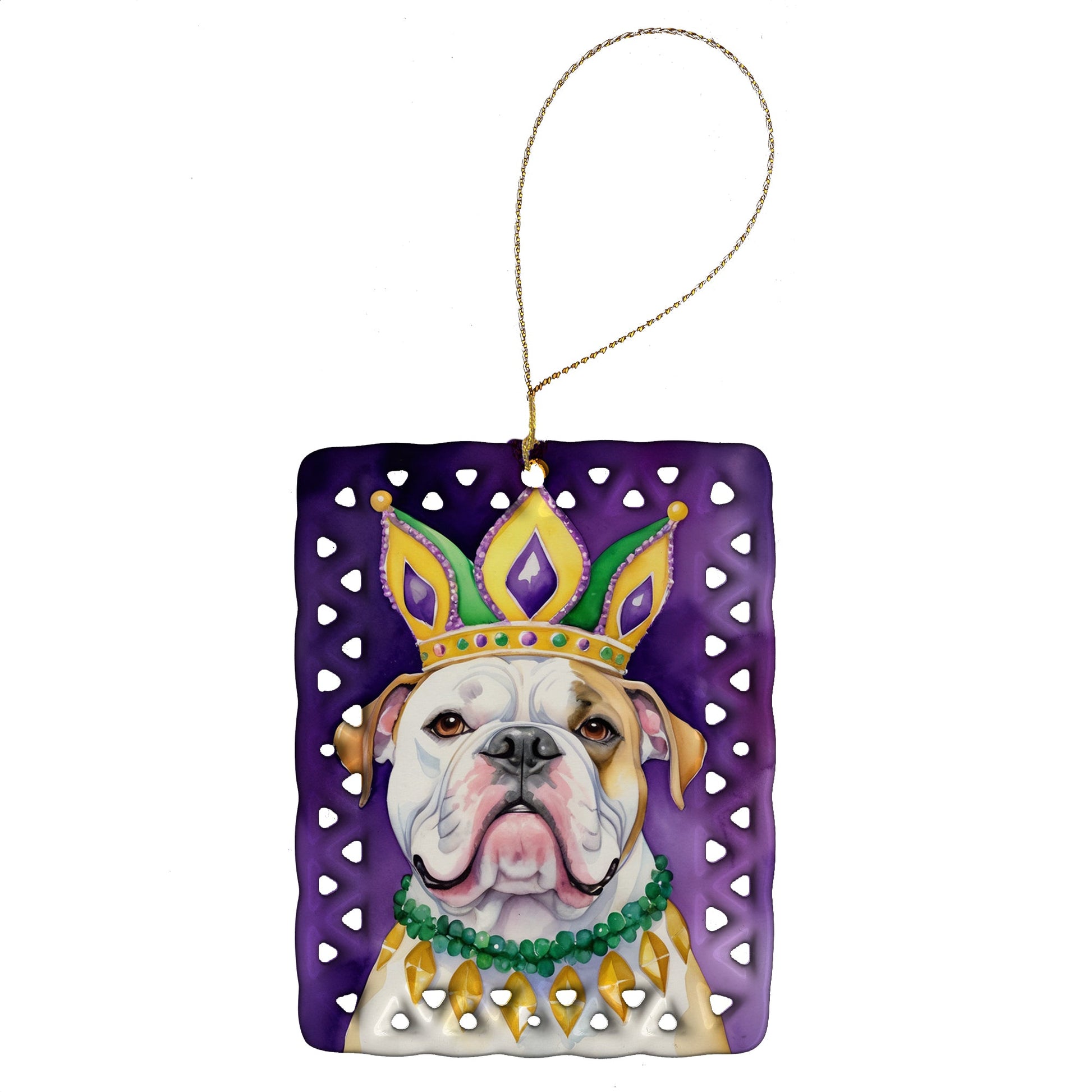 Porcelain Ornament featuring breed specific American Bulldog artwork. Celebrate Mardi Gras with this Mardi Gras Ornament. Add a unique, personal touch to your holiday decor with our Rectangular Lattice Porcelain Ornament. Perfect for creating cherished memories, this high-quality ornament shines under festive lights, reflecting warmth and joy throughout your Christmas tree. Crafted with a glossy finish, it showcases vibrant, full-color artwork contributed by our talented artists, ensuring your tree is adorned with a burst of color and holiday spirit. What sets this Porcelain Ornament apart is its customizable white back. Use a paint pen or permanent marker to write a heartfelt message, commemorate a special year, or mark an unforgettable date, turning this ornament into a keepsake that will be treasured for years to come. For best results, allow any personalization to dry thoroughly before handling. Each ornament comes complete with a delicate gold cord, making it easy to hang and display. Proudly made in the USA, this ornament measures 3.375 x 2.625 inches and is a thoughtful gift for pet sitters, teachers, family members, or anyone who would appreciate a little extra holiday magic. Bring style, charm, and a touch of personal meaning to your Christmas tree with this beautifully designed ornament..