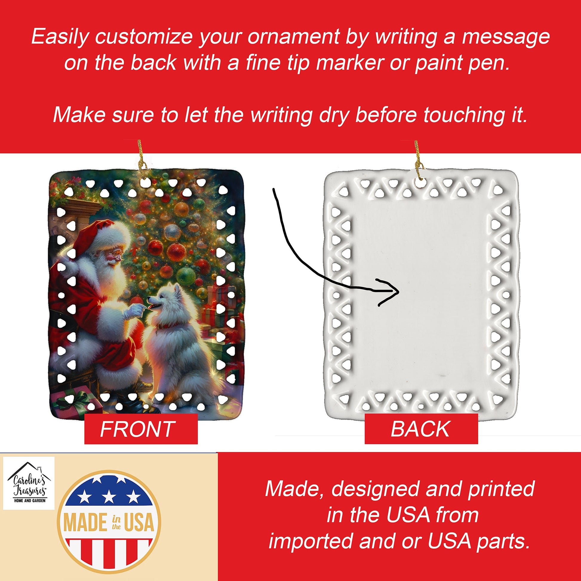 Porcelain Ornament featuring breed specific American Eskimo artwork. Celebrate Christmas with this Christmas Ornament. Add a unique, personal touch to your holiday decor with our Rectangular Lattice Porcelain Ornament. Perfect for creating cherished memories, this high-quality ornament shines under festive lights, reflecting warmth and joy throughout your Christmas tree. Crafted with a glossy finish, it showcases vibrant, full-color artwork contributed by our talented artists, ensuring your tree is adorned with a burst of color and holiday spirit. What sets this Porcelain Ornament apart is its customizable white back. Use a paint pen or permanent marker to write a heartfelt message, commemorate a special year, or mark an unforgettable date, turning this ornament into a keepsake that will be treasured for years to come. For best results, allow any personalization to dry thoroughly before handling. Each ornament comes complete with a delicate gold cord, making it easy to hang and display. Proudly made in the USA, this ornament measures 3.375 x 2.625 inches and is a thoughtful gift for pet sitters, teachers, family members, or anyone who would appreciate a little extra holiday magic. Bring style, charm, and a touch of personal meaning to your Christmas tree with this beautifully designed ornament..