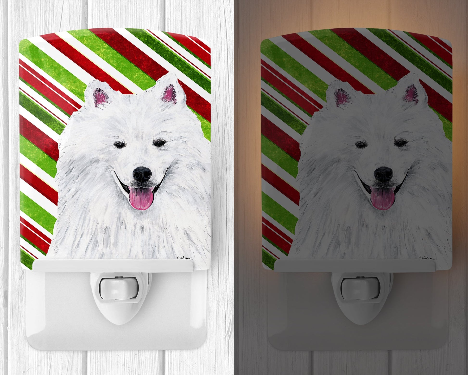Decorate your space with our Christmas American Eskimo artwork on a Night Light. Introduce a splash of artistic flair and subtle illumination to your space with the Decorative Ceramic Night Light from Caroline's Treasures. Perfect for any room, this night light seamlessly blends functionality with an aesthetic appeal, offering a stylish solution to brighten up dark corners of your home or office. Boasting a six-inch high by four-inch wide ceramic tile at the front, it showcases vivid, full-color artwork from distinguished artists, transforming a simple utility into a vibrant art piece. The artwork is securely encased in a robust metal holder, ensuring durability and longevity. Two screws are provided to firmly affix the tile into the holder. The holder extends three inches deep, housing an included bulb that emits a soft, welcoming glow. This product meets all safety standards, as evidenced by its UL approval. Proudly made in the United States from imported components, this Decorative Ceramic Night Light is not just a functional device; it's a statement piece that enhances the ambiance of your surroundings.