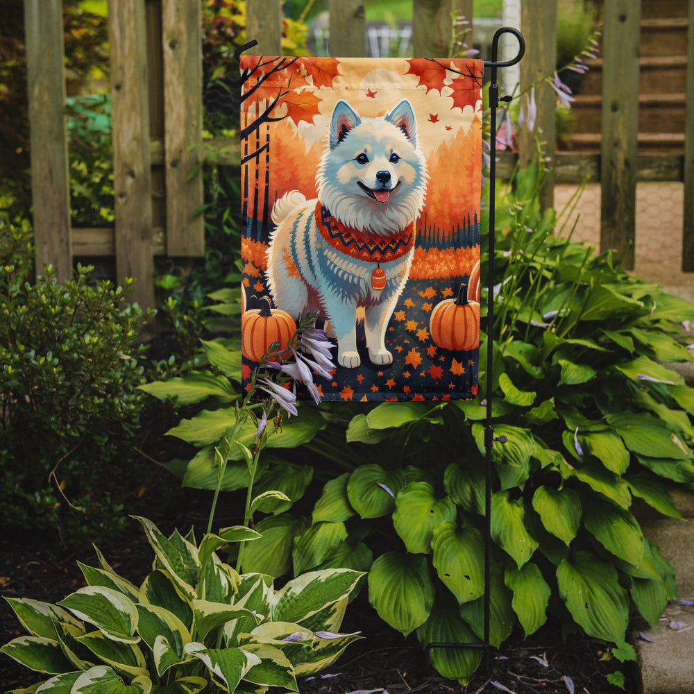 American Eskimo Fall Garden Flag – Dog Surrounded by Pumpkins & Autumn Leaves
