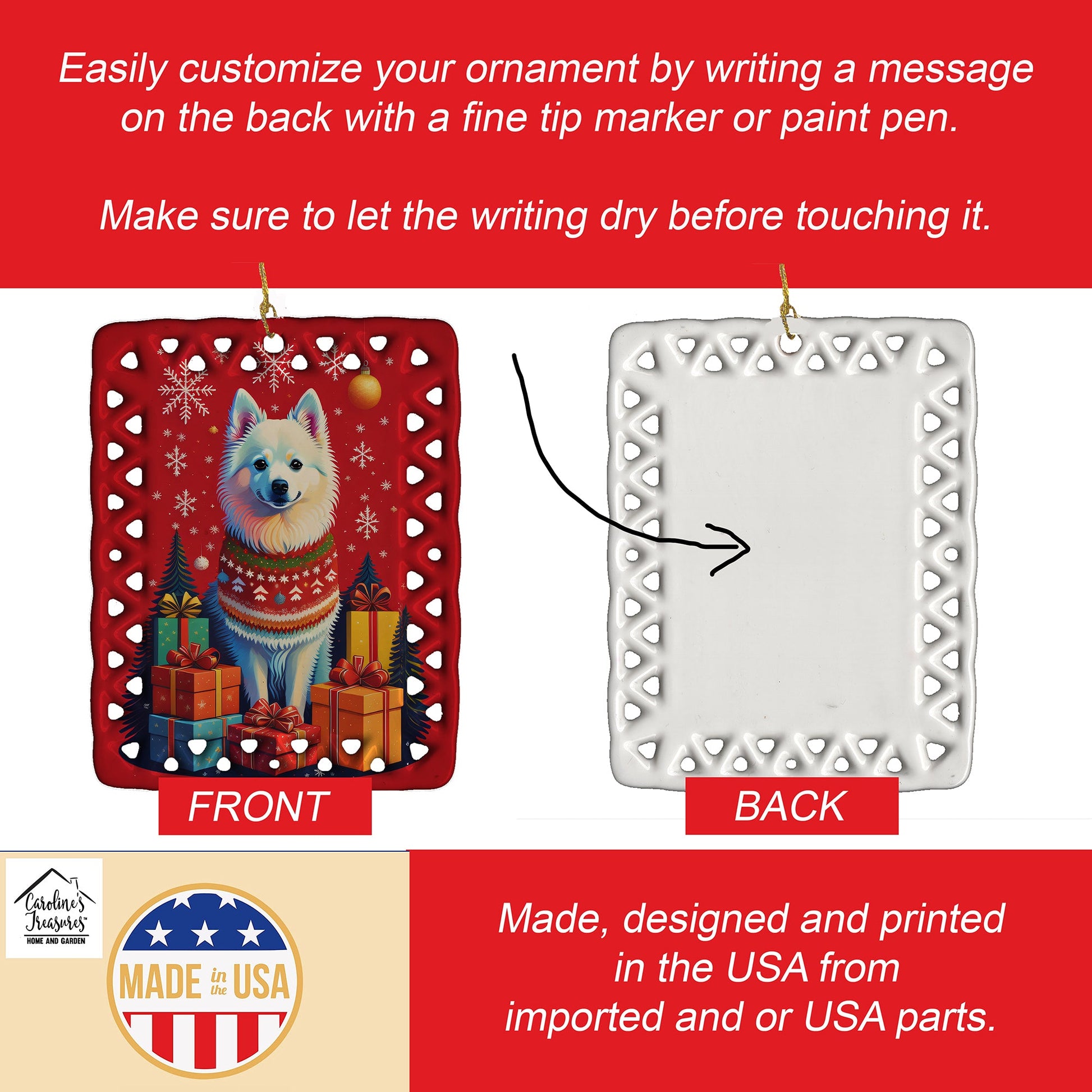 Porcelain Ornament featuring breed specific American Eskimo artwork. Celebrate Christmas with this Christmas Ornament. Add a unique, personal touch to your holiday decor with our Rectangular Lattice Porcelain Ornament. Perfect for creating cherished memories, this high-quality ornament shines under festive lights, reflecting warmth and joy throughout your Christmas tree. Crafted with a glossy finish, it showcases vibrant, full-color artwork contributed by our talented artists, ensuring your tree is adorned with a burst of color and holiday spirit. What sets this Porcelain Ornament apart is its customizable white back. Use a paint pen or permanent marker to write a heartfelt message, commemorate a special year, or mark an unforgettable date, turning this ornament into a keepsake that will be treasured for years to come. For best results, allow any personalization to dry thoroughly before handling. Each ornament comes complete with a delicate gold cord, making it easy to hang and display. Proudly made in the USA, this ornament measures 3.375 x 2.625 inches and is a thoughtful gift for pet sitters, teachers, family members, or anyone who would appreciate a little extra holiday magic. Bring style, charm, and a touch of personal meaning to your Christmas tree with this beautifully designed ornament..