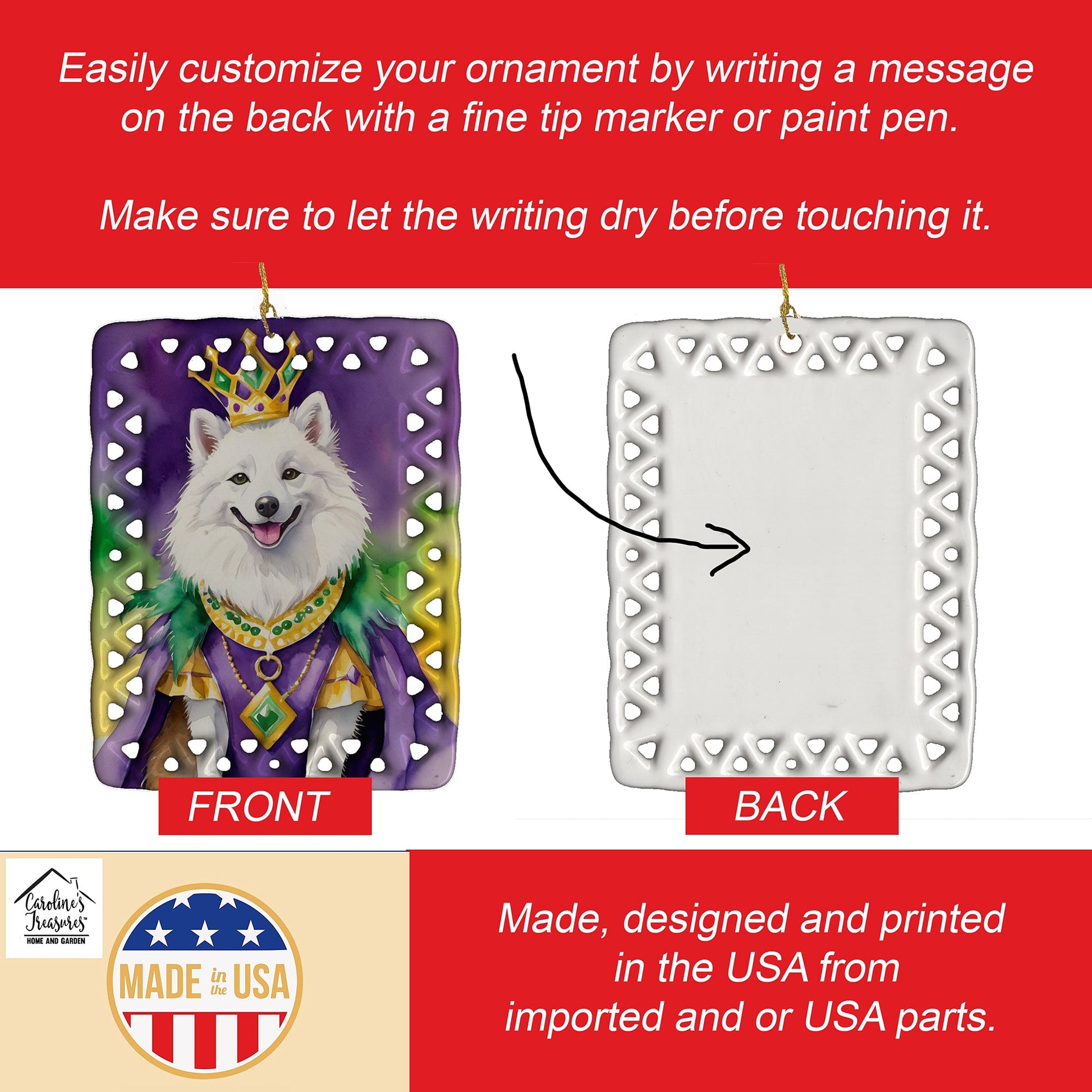 Porcelain Ornament featuring breed specific American Eskimo artwork. Celebrate Mardi Gras with this Mardi Gras Ornament. Add a unique, personal touch to your holiday decor with our Rectangular Lattice Porcelain Ornament. Perfect for creating cherished memories, this high-quality ornament shines under festive lights, reflecting warmth and joy throughout your Christmas tree. Crafted with a glossy finish, it showcases vibrant, full-color artwork contributed by our talented artists, ensuring your tree is adorned with a burst of color and holiday spirit. What sets this Porcelain Ornament apart is its customizable white back. Use a paint pen or permanent marker to write a heartfelt message, commemorate a special year, or mark an unforgettable date, turning this ornament into a keepsake that will be treasured for years to come. For best results, allow any personalization to dry thoroughly before handling. Each ornament comes complete with a delicate gold cord, making it easy to hang and display. Proudly made in the USA, this ornament measures 3.375 x 2.625 inches and is a thoughtful gift for pet sitters, teachers, family members, or anyone who would appreciate a little extra holiday magic. Bring style, charm, and a touch of personal meaning to your Christmas tree with this beautifully designed ornament..