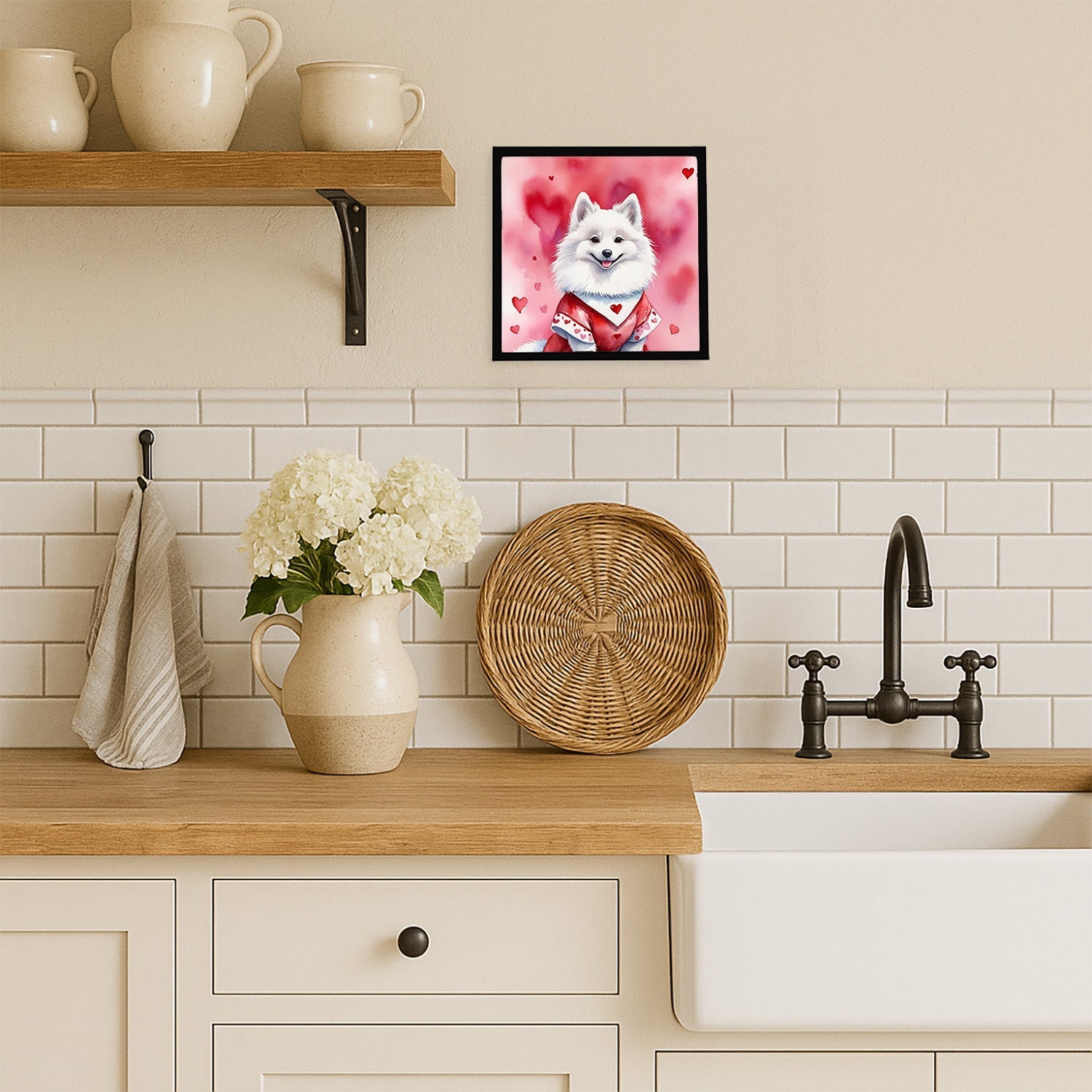 Framed Metal Print featuring breed specific American Eskimo artwork. Celebrate Valentine's Day with this Valentine's Day Framed Metal Print. Looking for wall art that’s stylish, safe, and made to last? Our 8x8 Framed Metal Prints are designed with modern living in mind. Each piece features original artwork printed on durable aluminum, set in a sleek frame that measures 3/4 inch deep for a clean, contemporary finish. Unlike glass prints, these are lightweight, shatter-free, and family-safe. Perfect for kitchens, bathrooms, or covered porches where traditional décor might not hold up. The built-in sawtooth hanger molded into the back makes it easy to hang right out of the box—just use your own nails or screws. Cleaning is simple too: a quick wipe with a damp cloth and mild soap keeps your artwork looking vibrant. Proudly made in Alabama, every print supports our community of artists while adding personality and charm to your home.