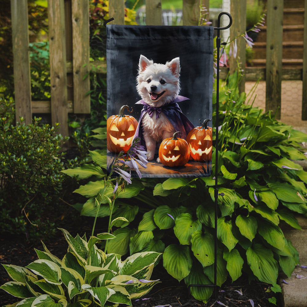 Garden Flag featuring breed specific American Eskimo artwork. Celebrate Halloween with this Halloween Garden Flag. Enhance the beauty of your garden, patio, or yard with Caroline's Treasures Decorative Garden Flag, proudly made in the USA. Crafted from two pieces of thick, double-sided polyester fabric, this 2-ply garden flag is designed to withstand various weather conditions, making it water-resistant and weatherproof. Featuring correctly readable words on both sides, this garden flag offers a delightful visual experience from any angle. With its heavier weight, it stands out among other garden flags, ensuring stability and durability even in wind, rain, and snow. Measuring approximately 11 1/4 inches by 15 1/2 inches, this flag allows you to personalize your outdoor decor. It comes with a 1 1/2-inch sleeve sewn in, allowing easy attachment to any standard garden flag stand or garden size porch hanger (sold separately). Make a statement in your outdoor space with Caroline's Treasures Decorative Garden Flag, a vibrant and high-quality flag that adds color and personality to your surroundings. Proudly made in the USA, it's a symbol of quality craftsmanship and attention to detail.