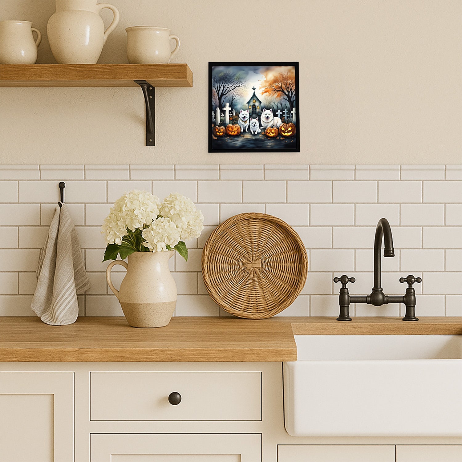 Framed Metal Print featuring breed specific American Eskimo artwork. Celebrate Halloween with this Halloween Framed Metal Print. Looking for wall art that’s stylish, safe, and made to last? Our 8x8 Framed Metal Prints are designed with modern living in mind. Each piece features original artwork printed on durable aluminum, set in a sleek frame that measures 3/4 inch deep for a clean, contemporary finish. Unlike glass prints, these are lightweight, shatter-free, and family-safe. Perfect for kitchens, bathrooms, or covered porches where traditional décor might not hold up. The built-in sawtooth hanger molded into the back makes it easy to hang right out of the box—just use your own nails or screws. Cleaning is simple too: a quick wipe with a damp cloth and mild soap keeps your artwork looking vibrant. Proudly made in Alabama, every print supports our community of artists while adding personality and charm to your home.