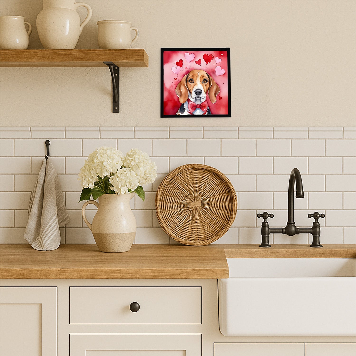 Framed Metal Print featuring breed specific American Foxhound artwork. Celebrate Valentine's Day with this Valentine's Day Framed Metal Print. Looking for wall art that’s stylish, safe, and made to last? Our 8x8 Framed Metal Prints are designed with modern living in mind. Each piece features original artwork printed on durable aluminum, set in a sleek frame that measures 3/4 inch deep for a clean, contemporary finish. Unlike glass prints, these are lightweight, shatter-free, and family-safe. Perfect for kitchens, bathrooms, or covered porches where traditional décor might not hold up. The built-in sawtooth hanger molded into the back makes it easy to hang right out of the box—just use your own nails or screws. Cleaning is simple too: a quick wipe with a damp cloth and mild soap keeps your artwork looking vibrant. Proudly made in Alabama, every print supports our community of artists while adding personality and charm to your home.