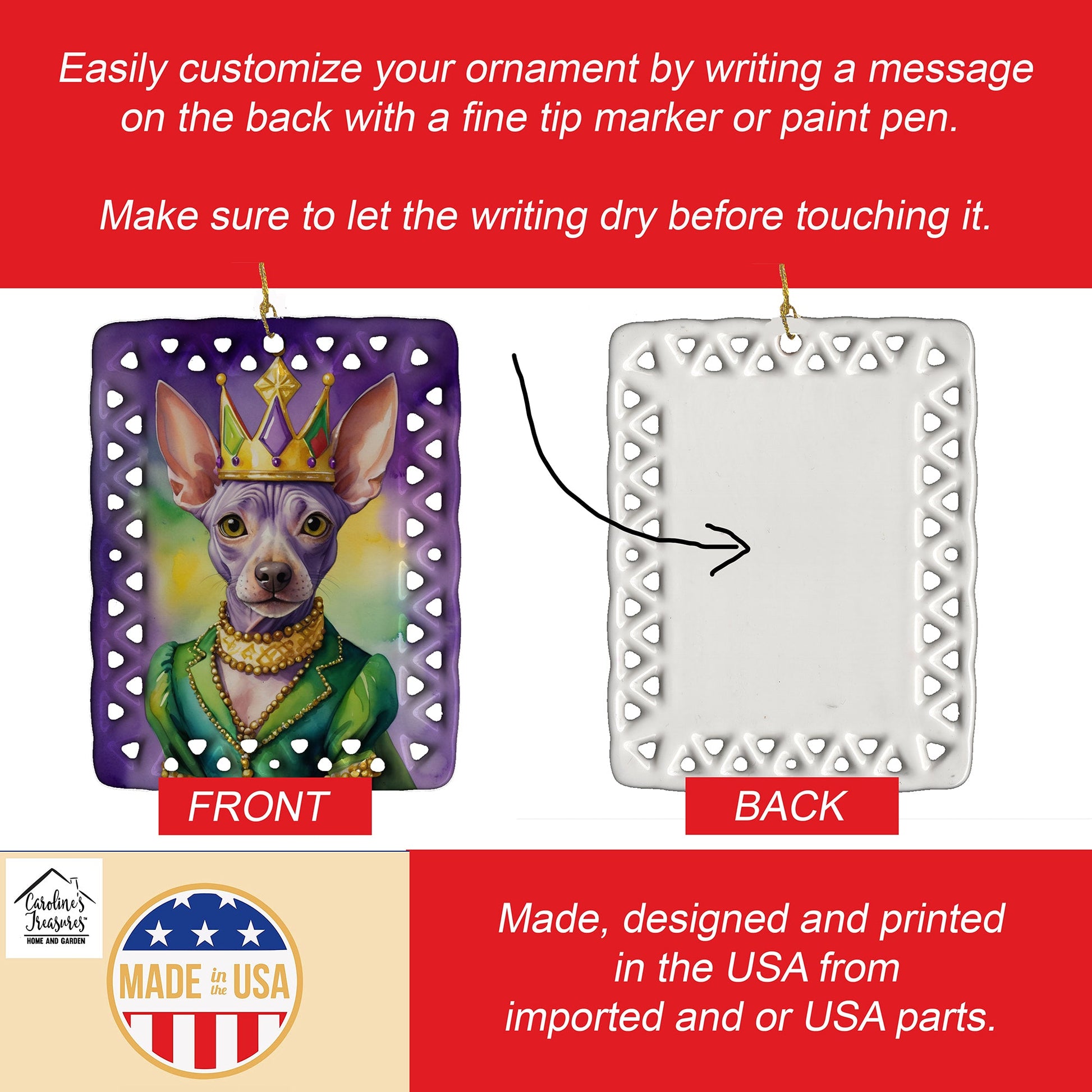 Porcelain Ornament featuring breed specific American Hairless Terrier artwork. Celebrate Mardi Gras with this Mardi Gras Ornament. Add a unique, personal touch to your holiday decor with our Rectangular Lattice Porcelain Ornament. Perfect for creating cherished memories, this high-quality ornament shines under festive lights, reflecting warmth and joy throughout your Christmas tree. Crafted with a glossy finish, it showcases vibrant, full-color artwork contributed by our talented artists, ensuring your tree is adorned with a burst of color and holiday spirit. What sets this Porcelain Ornament apart is its customizable white back. Use a paint pen or permanent marker to write a heartfelt message, commemorate a special year, or mark an unforgettable date, turning this ornament into a keepsake that will be treasured for years to come. For best results, allow any personalization to dry thoroughly before handling. Each ornament comes complete with a delicate gold cord, making it easy to hang and display. Proudly made in the USA, this ornament measures 3.375 x 2.625 inches and is a thoughtful gift for pet sitters, teachers, family members, or anyone who would appreciate a little extra holiday magic. Bring style, charm, and a touch of personal meaning to your Christmas tree with this beautifully designed ornament..