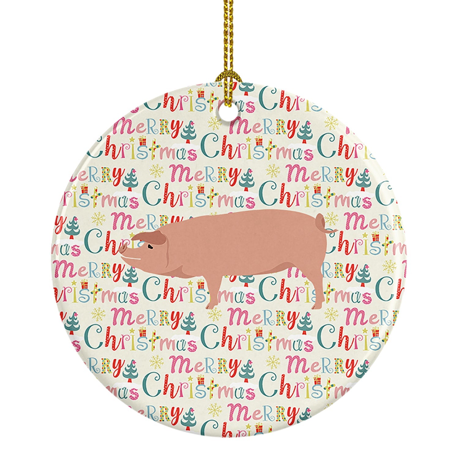 Decorate your space with our Christmas American Landrace Pig artwork on a Ornament. Add a touch of personalized charm to your Christmas tree this holiday season with our Ceramic Ornament. Measuring 2.8125 inches in diameter, this round porcelain ornament beautifully reflects your festive lights, enhancing your holiday decor. The gloss surface sets off the vibrant, full-color artwork contributed by one of our talented artists, bringing a pop of color and joy to your tree. This Ceramic Ornament doesn't stop at being merely decorative. The white back is designed for personalization. Write a heartfelt message, mark a special year, or inscribe a date with a paint pen or a permanent marker to create a treasured memento. Please ensure you allow any personalization to dry thoroughly before handling to maintain the pristine finish. Included with the ornament is a delicate gold cord for easy hanging. Made in the USA, this Ceramic Ornament makes an exceptional gift for a pet sitter, teacher, family member, or anyone you wish to share a little Christmas magic with. With its blend of style, charm, and personal touch, it's a meaningful addition to any Christmas tree.