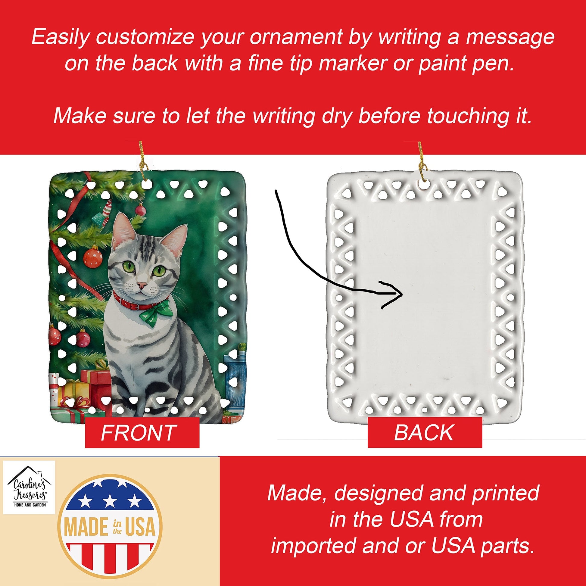 Porcelain Ornament featuring breed specific American Shorthair artwork. Celebrate Christmas with this Christmas Ornament. Add a unique, personal touch to your holiday decor with our Rectangular Lattice Porcelain Ornament. Perfect for creating cherished memories, this high-quality ornament shines under festive lights, reflecting warmth and joy throughout your Christmas tree. Crafted with a glossy finish, it showcases vibrant, full-color artwork contributed by our talented artists, ensuring your tree is adorned with a burst of color and holiday spirit. What sets this Porcelain Ornament apart is its customizable white back. Use a paint pen or permanent marker to write a heartfelt message, commemorate a special year, or mark an unforgettable date, turning this ornament into a keepsake that will be treasured for years to come. For best results, allow any personalization to dry thoroughly before handling. Each ornament comes complete with a delicate gold cord, making it easy to hang and display. Proudly made in the USA, this ornament measures 3.375 x 2.625 inches and is a thoughtful gift for pet sitters, teachers, family members, or anyone who would appreciate a little extra holiday magic. Bring style, charm, and a touch of personal meaning to your Christmas tree with this beautifully designed ornament..