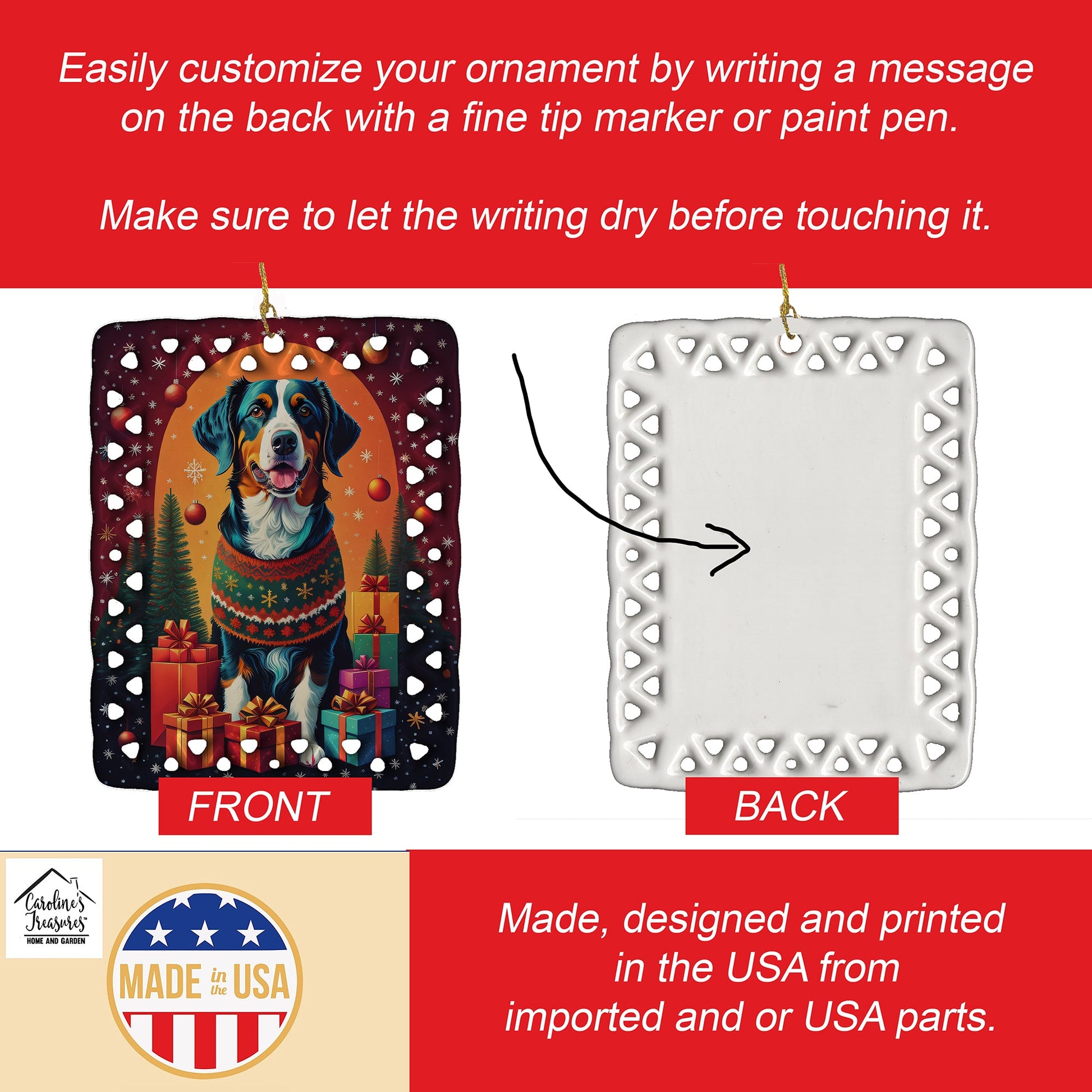 Porcelain Ornament featuring breed specific Appenzeller Sennenhund artwork. Celebrate Christmas with this Christmas Ornament. Add a unique, personal touch to your holiday decor with our Rectangular Lattice Porcelain Ornament. Perfect for creating cherished memories, this high-quality ornament shines under festive lights, reflecting warmth and joy throughout your Christmas tree. Crafted with a glossy finish, it showcases vibrant, full-color artwork contributed by our talented artists, ensuring your tree is adorned with a burst of color and holiday spirit. What sets this Porcelain Ornament apart is its customizable white back. Use a paint pen or permanent marker to write a heartfelt message, commemorate a special year, or mark an unforgettable date, turning this ornament into a keepsake that will be treasured for years to come. For best results, allow any personalization to dry thoroughly before handling. Each ornament comes complete with a delicate gold cord, making it easy to hang and display. Proudly made in the USA, this ornament measures 3.375 x 2.625 inches and is a thoughtful gift for pet sitters, teachers, family members, or anyone who would appreciate a little extra holiday magic. Bring style, charm, and a touch of personal meaning to your Christmas tree with this beautifully designed ornament..