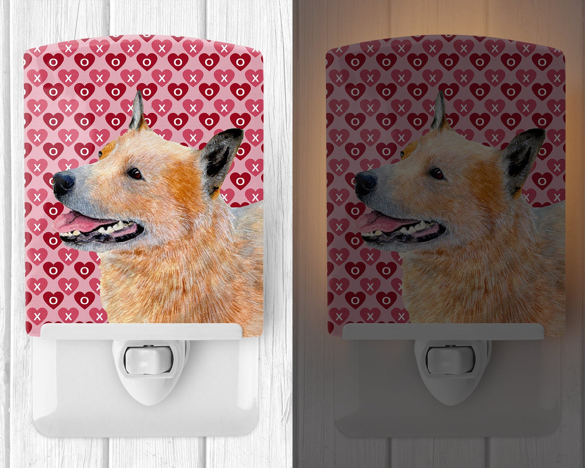 Decorate your space with our Valentine's Day Australian Cattle Dog artwork on a Night Light. Introduce a splash of artistic flair and subtle illumination to your space with the Decorative Ceramic Night Light from Caroline's Treasures. Perfect for any room, this night light seamlessly blends functionality with an aesthetic appeal, offering a stylish solution to brighten up dark corners of your home or office. Boasting a six-inch high by four-inch wide ceramic tile at the front, it showcases vivid, full-color artwork from distinguished artists, transforming a simple utility into a vibrant art piece. The artwork is securely encased in a robust metal holder, ensuring durability and longevity. Two screws are provided to firmly affix the tile into the holder. The holder extends three inches deep, housing an included bulb that emits a soft, welcoming glow. This product meets all safety standards, as evidenced by its UL approval. Proudly made in the United States from imported components, this Decorative Ceramic Night Light is not just a functional device; it's a statement piece that enhances the ambiance of your surroundings.
