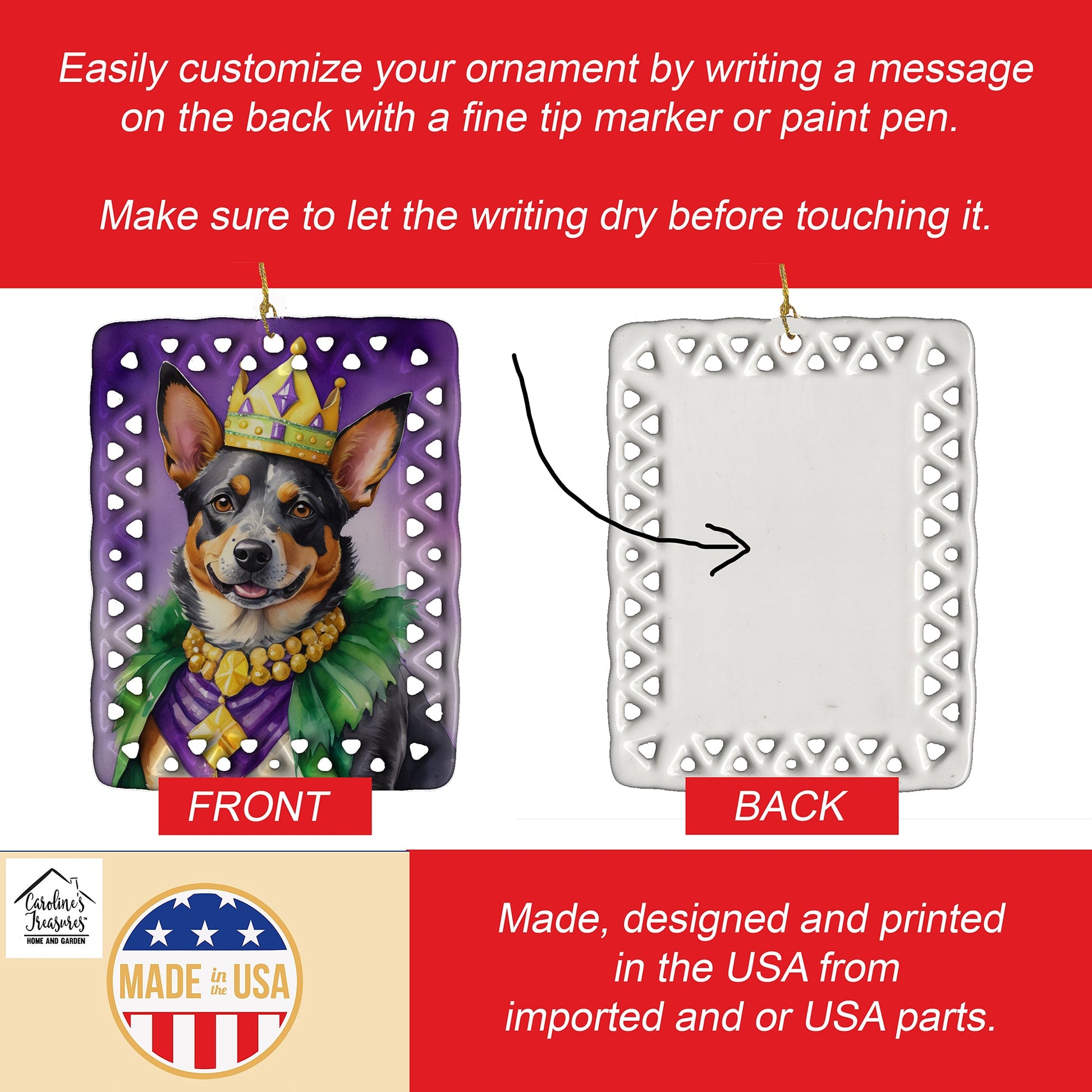 Porcelain Ornament featuring breed specific Australian Cattle Dog artwork. Celebrate Mardi Gras with this Mardi Gras Ornament. Add a unique, personal touch to your holiday decor with our Rectangular Lattice Porcelain Ornament. Perfect for creating cherished memories, this high-quality ornament shines under festive lights, reflecting warmth and joy throughout your Christmas tree. Crafted with a glossy finish, it showcases vibrant, full-color artwork contributed by our talented artists, ensuring your tree is adorned with a burst of color and holiday spirit. What sets this Porcelain Ornament apart is its customizable white back. Use a paint pen or permanent marker to write a heartfelt message, commemorate a special year, or mark an unforgettable date, turning this ornament into a keepsake that will be treasured for years to come. For best results, allow any personalization to dry thoroughly before handling. Each ornament comes complete with a delicate gold cord, making it easy to hang and display. Proudly made in the USA, this ornament measures 3.375 x 2.625 inches and is a thoughtful gift for pet sitters, teachers, family members, or anyone who would appreciate a little extra holiday magic. Bring style, charm, and a touch of personal meaning to your Christmas tree with this beautifully designed ornament..