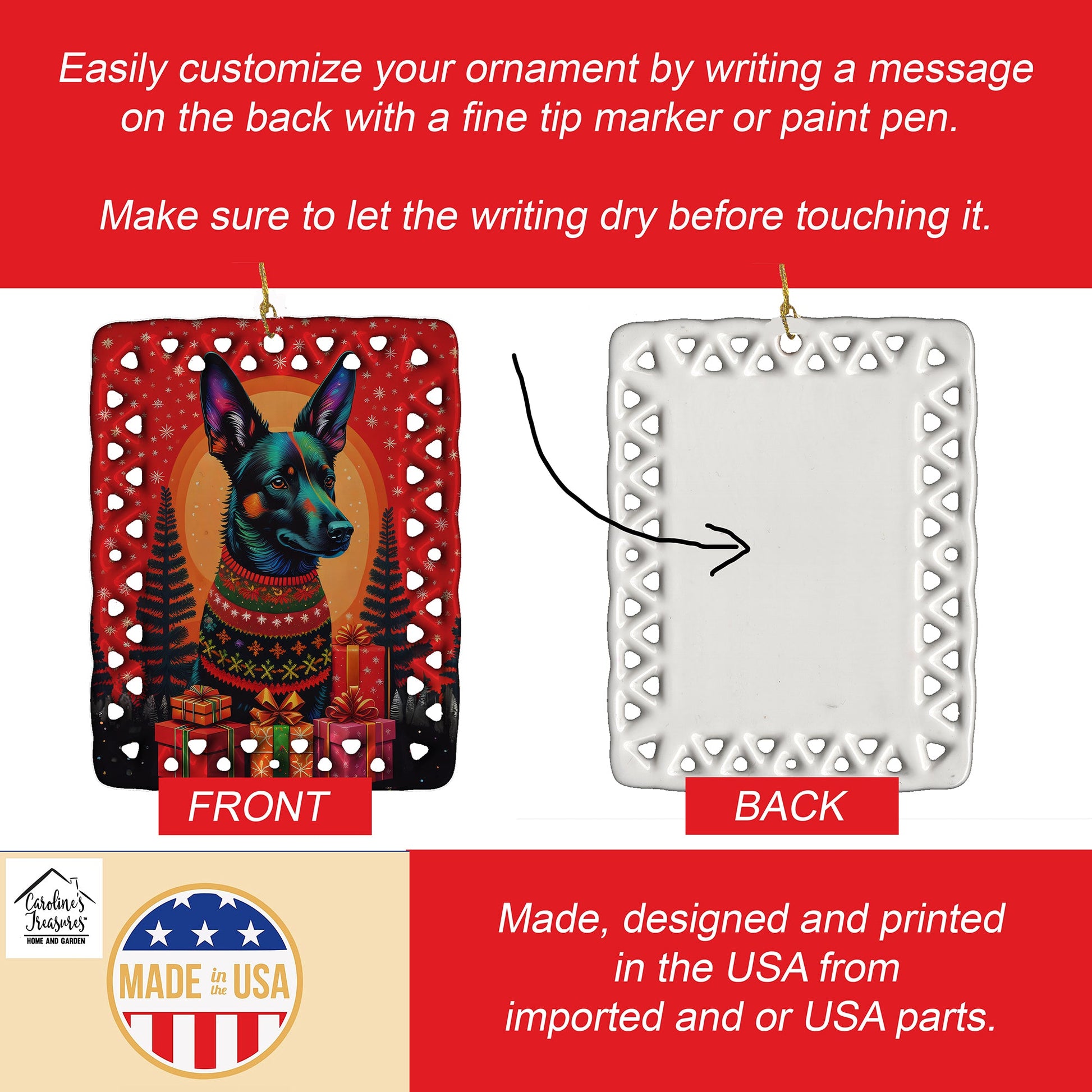Porcelain Ornament featuring breed specific Australian Kelpie artwork. Celebrate Christmas with this Christmas Ornament. Add a unique, personal touch to your holiday decor with our Rectangular Lattice Porcelain Ornament. Perfect for creating cherished memories, this high-quality ornament shines under festive lights, reflecting warmth and joy throughout your Christmas tree. Crafted with a glossy finish, it showcases vibrant, full-color artwork contributed by our talented artists, ensuring your tree is adorned with a burst of color and holiday spirit. What sets this Porcelain Ornament apart is its customizable white back. Use a paint pen or permanent marker to write a heartfelt message, commemorate a special year, or mark an unforgettable date, turning this ornament into a keepsake that will be treasured for years to come. For best results, allow any personalization to dry thoroughly before handling. Each ornament comes complete with a delicate gold cord, making it easy to hang and display. Proudly made in the USA, this ornament measures 3.375 x 2.625 inches and is a thoughtful gift for pet sitters, teachers, family members, or anyone who would appreciate a little extra holiday magic. Bring style, charm, and a touch of personal meaning to your Christmas tree with this beautifully designed ornament..