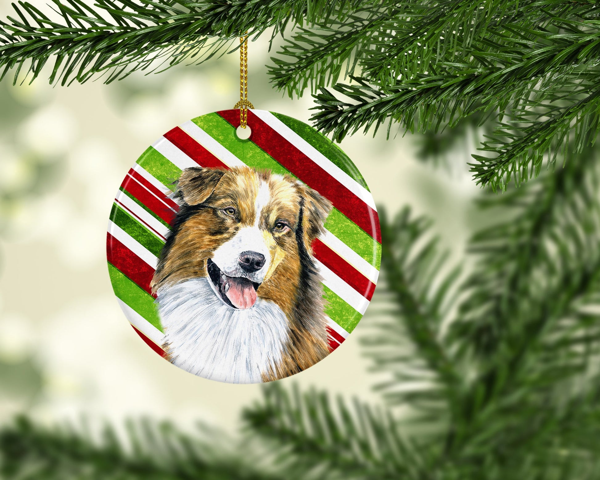 Australian Shepherd Candy Cane Holiday Christmas Ornament - Round Ceramic Ornament – Artist-Designed Keepsake Decoration SC9357