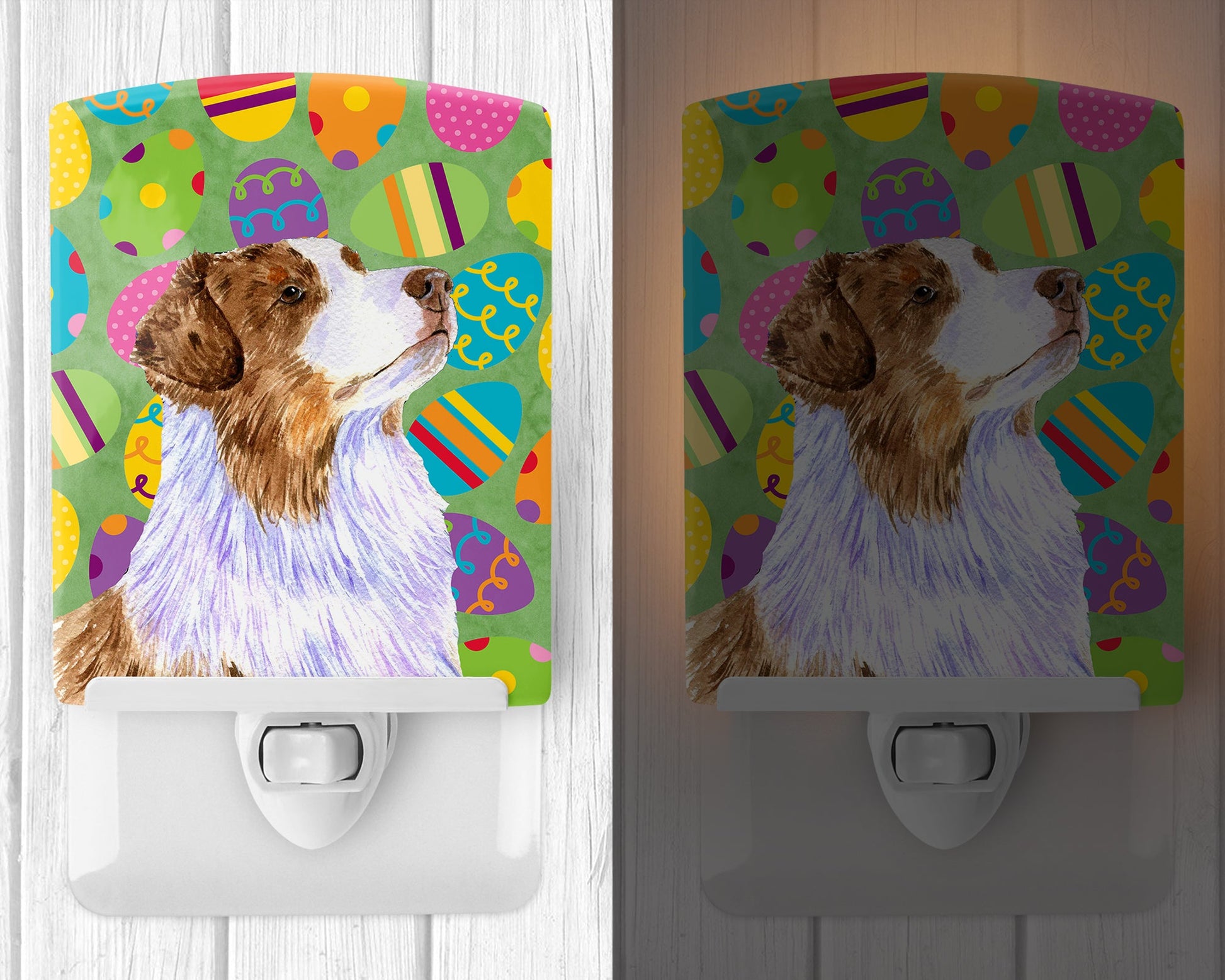 Decorate your space with our Easter Australian Shepherd artwork on a Night Light. Introduce a splash of artistic flair and subtle illumination to your space with the Decorative Ceramic Night Light from Caroline's Treasures. Perfect for any room, this night light seamlessly blends functionality with an aesthetic appeal, offering a stylish solution to brighten up dark corners of your home or office. Boasting a six-inch high by four-inch wide ceramic tile at the front, it showcases vivid, full-color artwork from distinguished artists, transforming a simple utility into a vibrant art piece. The artwork is securely encased in a robust metal holder, ensuring durability and longevity. Two screws are provided to firmly affix the tile into the holder. The holder extends three inches deep, housing an included bulb that emits a soft, welcoming glow. This product meets all safety standards, as evidenced by its UL approval. Proudly made in the United States from imported components, this Decorative Ceramic Night Light is not just a functional device; it's a statement piece that enhances the ambiance of your surroundings.