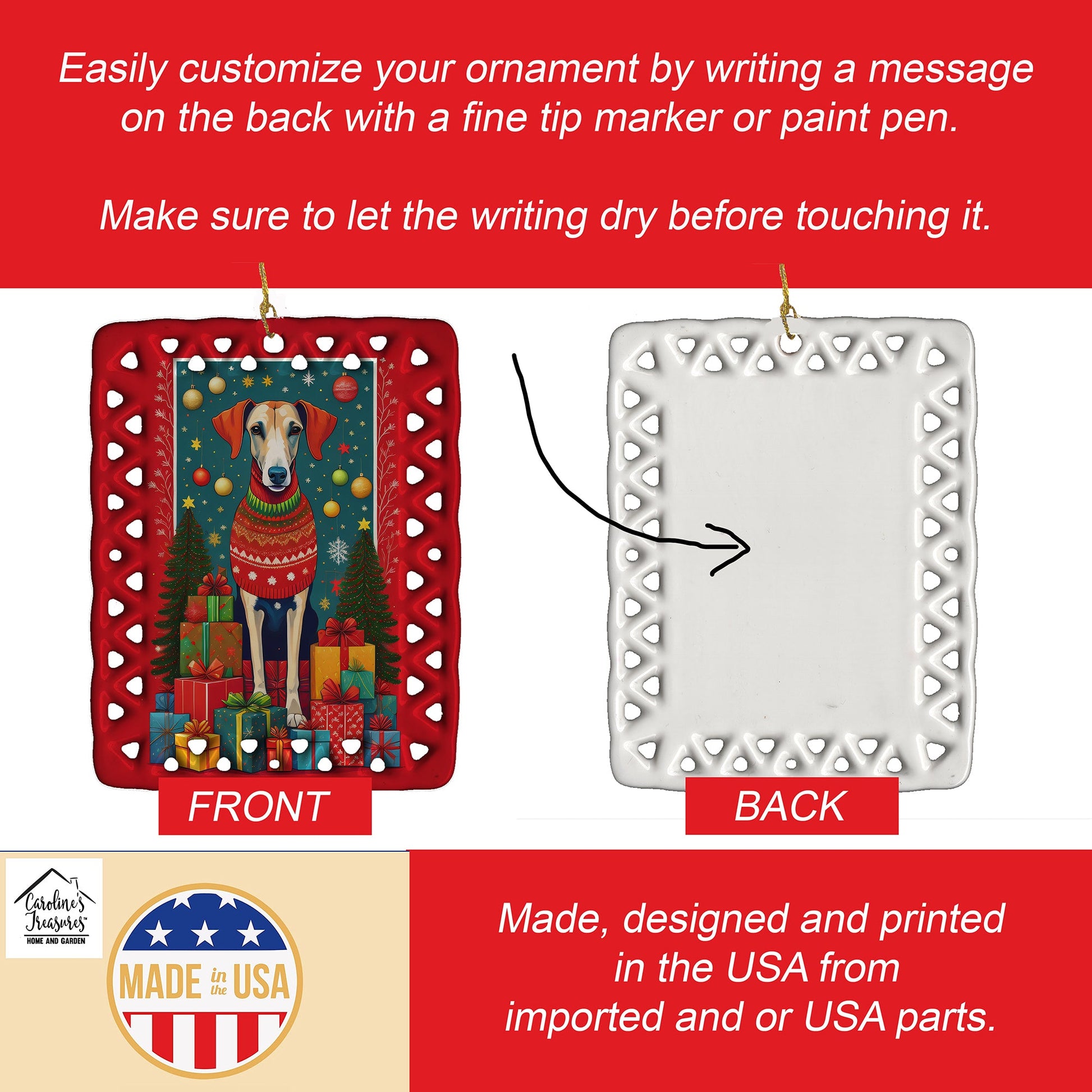 Porcelain Ornament featuring breed specific Azawakh Hound artwork. Celebrate Christmas with this Christmas Ornament. Add a unique, personal touch to your holiday decor with our Rectangular Lattice Porcelain Ornament. Perfect for creating cherished memories, this high-quality ornament shines under festive lights, reflecting warmth and joy throughout your Christmas tree. Crafted with a glossy finish, it showcases vibrant, full-color artwork contributed by our talented artists, ensuring your tree is adorned with a burst of color and holiday spirit. What sets this Porcelain Ornament apart is its customizable white back. Use a paint pen or permanent marker to write a heartfelt message, commemorate a special year, or mark an unforgettable date, turning this ornament into a keepsake that will be treasured for years to come. For best results, allow any personalization to dry thoroughly before handling. Each ornament comes complete with a delicate gold cord, making it easy to hang and display. Proudly made in the USA, this ornament measures 3.375 x 2.625 inches and is a thoughtful gift for pet sitters, teachers, family members, or anyone who would appreciate a little extra holiday magic. Bring style, charm, and a touch of personal meaning to your Christmas tree with this beautifully designed ornament..