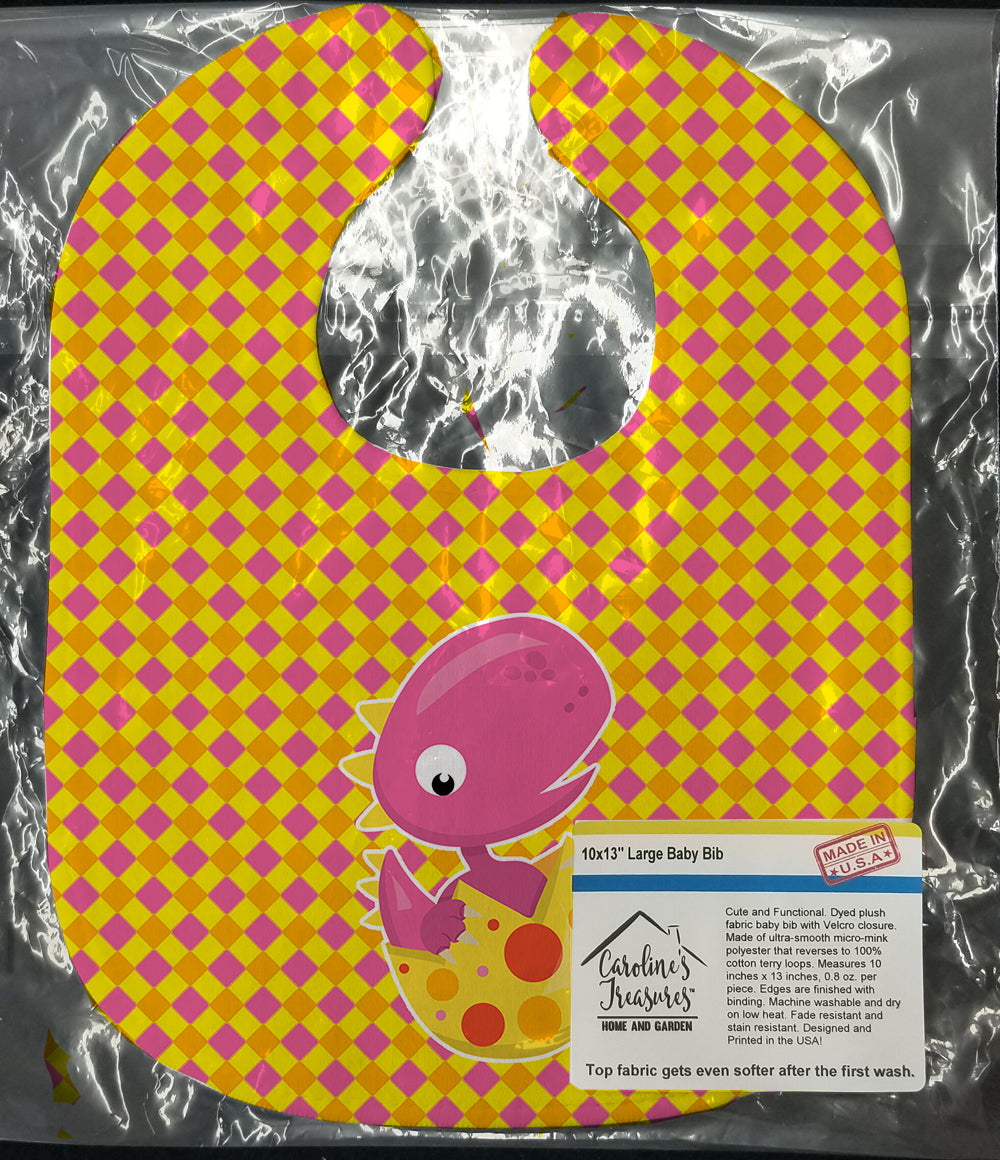 Decorate your space with our Baby T-Rex artwork on a Baby Bib. Cute and Functional. Dyed plush fabric baby bib with Velcro closure. Made of ultra-smooth micro-mink polyester that reverses to 100% cotton terry loops. Measures 10 inches x 13 inches, 0.8 oz. per piece. Edges are finished with binding. Machine washable and dry on low heat. Fade resistant and stain resistant. Top fabric gets even softer after the first wash.