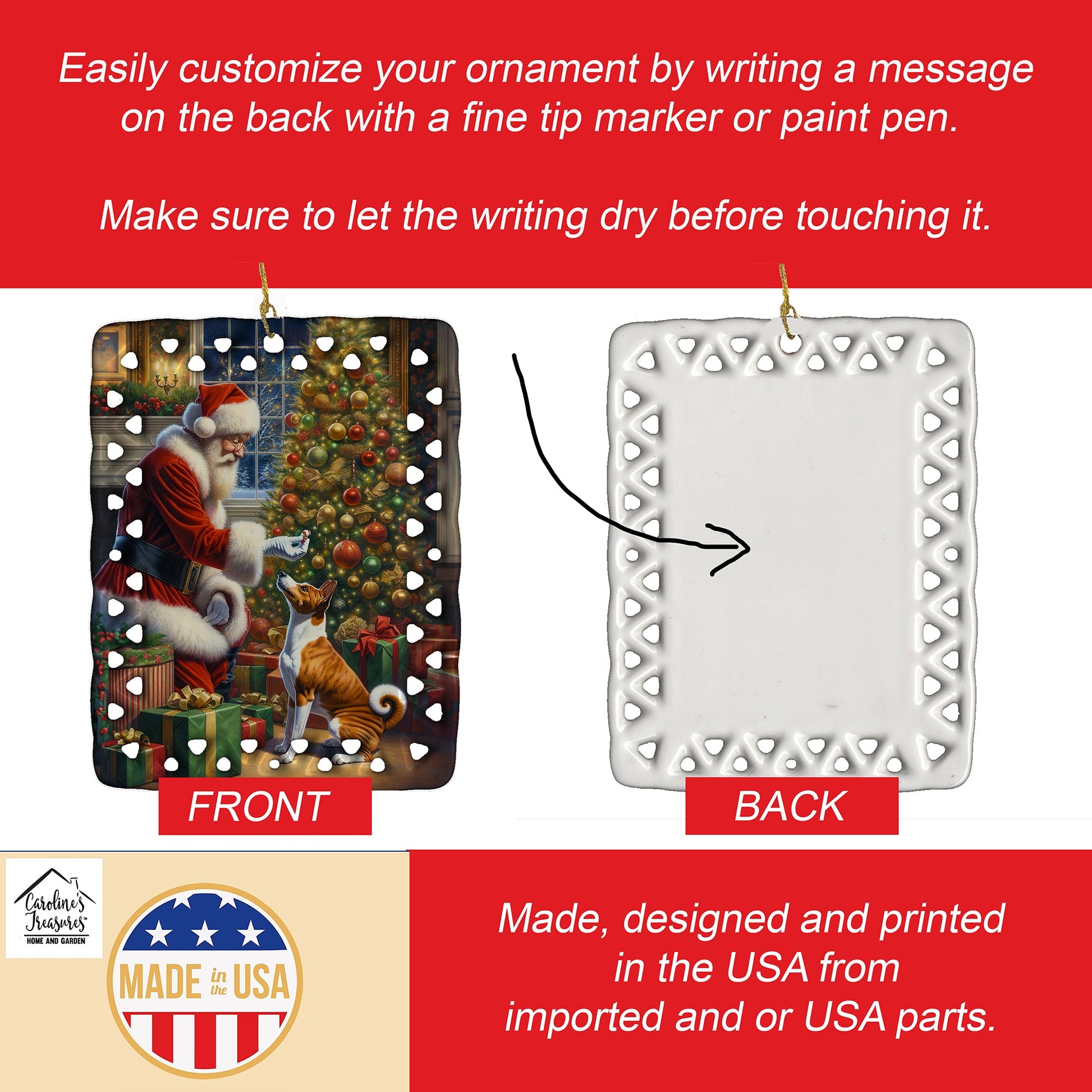 Porcelain Ornament featuring breed specific Basenji artwork. Celebrate Christmas with this Christmas Ornament. Add a unique, personal touch to your holiday decor with our Rectangular Lattice Porcelain Ornament. Perfect for creating cherished memories, this high-quality ornament shines under festive lights, reflecting warmth and joy throughout your Christmas tree. Crafted with a glossy finish, it showcases vibrant, full-color artwork contributed by our talented artists, ensuring your tree is adorned with a burst of color and holiday spirit. What sets this Porcelain Ornament apart is its customizable white back. Use a paint pen or permanent marker to write a heartfelt message, commemorate a special year, or mark an unforgettable date, turning this ornament into a keepsake that will be treasured for years to come. For best results, allow any personalization to dry thoroughly before handling. Each ornament comes complete with a delicate gold cord, making it easy to hang and display. Proudly made in the USA, this ornament measures 3.375 x 2.625 inches and is a thoughtful gift for pet sitters, teachers, family members, or anyone who would appreciate a little extra holiday magic. Bring style, charm, and a touch of personal meaning to your Christmas tree with this beautifully designed ornament..