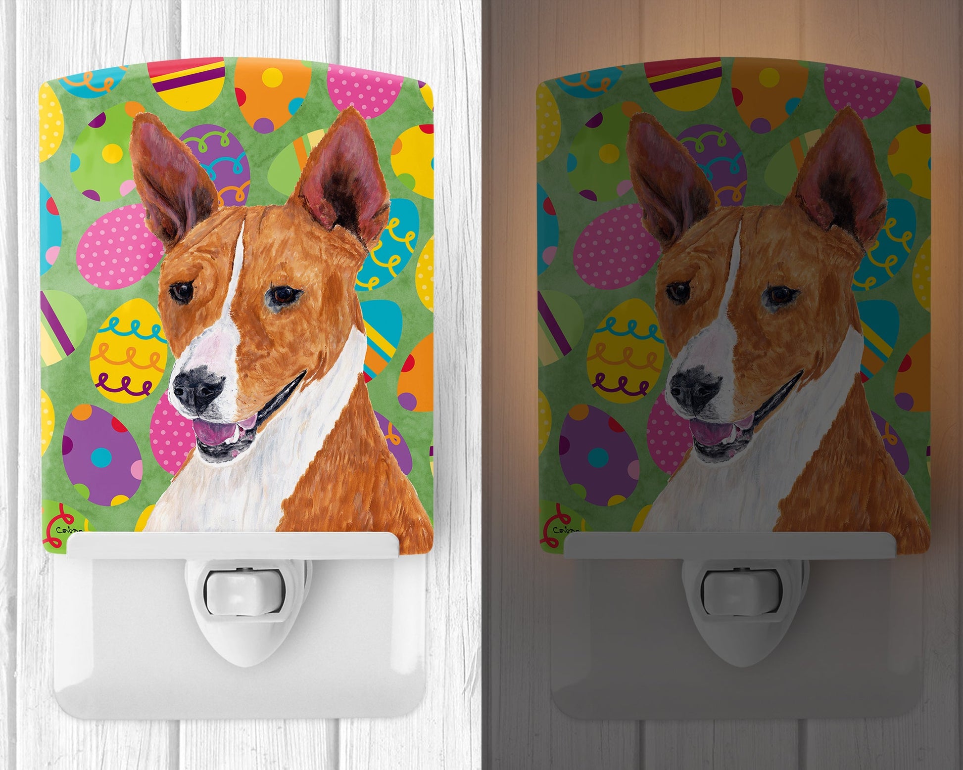 Decorate your space with our Easter Basenji artwork on a Night Light. Introduce a splash of artistic flair and subtle illumination to your space with the Decorative Ceramic Night Light from Caroline's Treasures. Perfect for any room, this night light seamlessly blends functionality with an aesthetic appeal, offering a stylish solution to brighten up dark corners of your home or office. Boasting a six-inch high by four-inch wide ceramic tile at the front, it showcases vivid, full-color artwork from distinguished artists, transforming a simple utility into a vibrant art piece. The artwork is securely encased in a robust metal holder, ensuring durability and longevity. Two screws are provided to firmly affix the tile into the holder. The holder extends three inches deep, housing an included bulb that emits a soft, welcoming glow. This product meets all safety standards, as evidenced by its UL approval. Proudly made in the United States from imported components, this Decorative Ceramic Night Light is not just a functional device; it's a statement piece that enhances the ambiance of your surroundings.