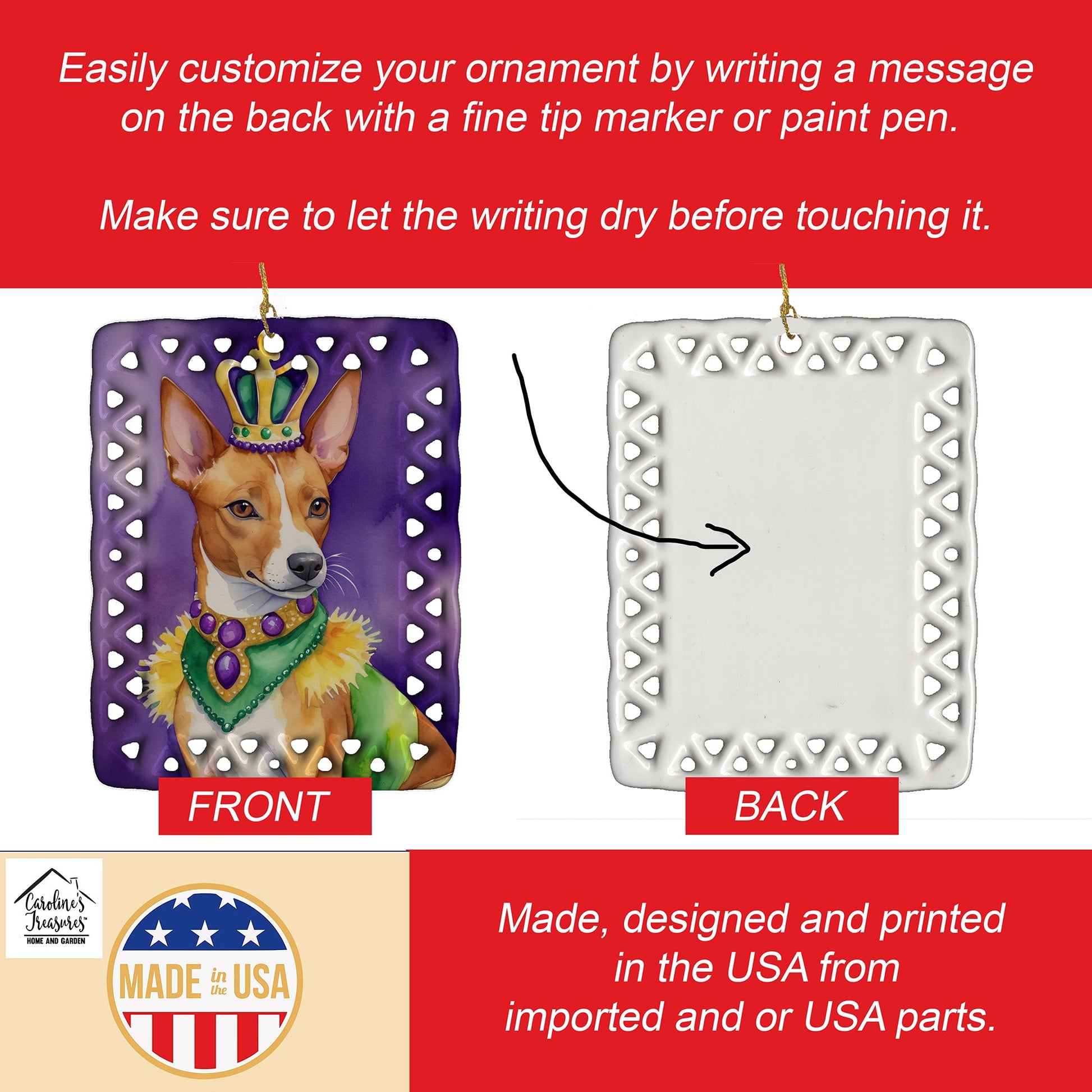 Porcelain Ornament featuring breed specific Basenji artwork. Celebrate Mardi Gras with this Mardi Gras Ornament. Add a unique, personal touch to your holiday decor with our Rectangular Lattice Porcelain Ornament. Perfect for creating cherished memories, this high-quality ornament shines under festive lights, reflecting warmth and joy throughout your Christmas tree. Crafted with a glossy finish, it showcases vibrant, full-color artwork contributed by our talented artists, ensuring your tree is adorned with a burst of color and holiday spirit. What sets this Porcelain Ornament apart is its customizable white back. Use a paint pen or permanent marker to write a heartfelt message, commemorate a special year, or mark an unforgettable date, turning this ornament into a keepsake that will be treasured for years to come. For best results, allow any personalization to dry thoroughly before handling. Each ornament comes complete with a delicate gold cord, making it easy to hang and display. Proudly made in the USA, this ornament measures 3.375 x 2.625 inches and is a thoughtful gift for pet sitters, teachers, family members, or anyone who would appreciate a little extra holiday magic. Bring style, charm, and a touch of personal meaning to your Christmas tree with this beautifully designed ornament..