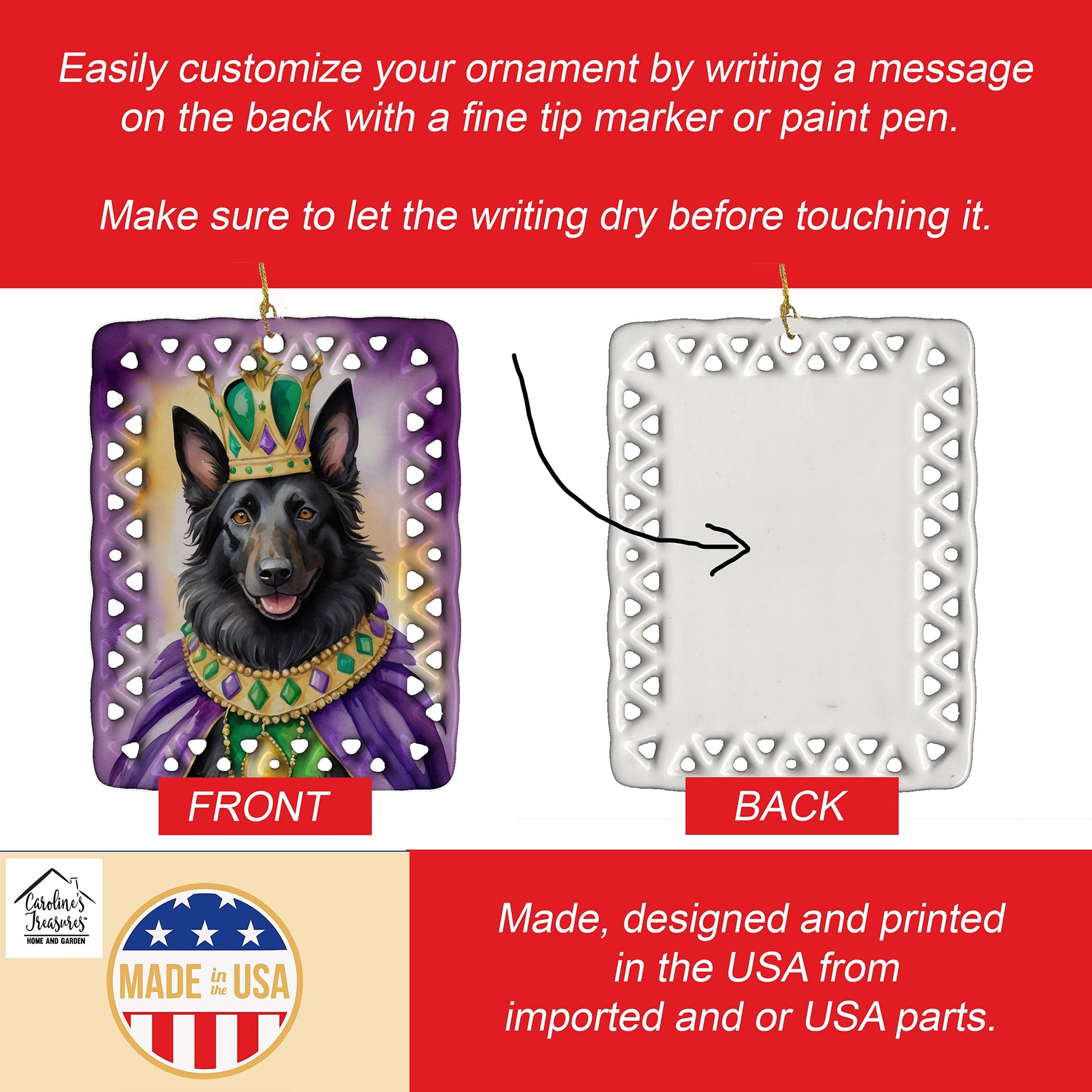 Porcelain Ornament featuring breed specific Belgian Sheepdog artwork. Celebrate Mardi Gras with this Mardi Gras Ornament. Add a unique, personal touch to your holiday decor with our Rectangular Lattice Porcelain Ornament. Perfect for creating cherished memories, this high-quality ornament shines under festive lights, reflecting warmth and joy throughout your Christmas tree. Crafted with a glossy finish, it showcases vibrant, full-color artwork contributed by our talented artists, ensuring your tree is adorned with a burst of color and holiday spirit. What sets this Porcelain Ornament apart is its customizable white back. Use a paint pen or permanent marker to write a heartfelt message, commemorate a special year, or mark an unforgettable date, turning this ornament into a keepsake that will be treasured for years to come. For best results, allow any personalization to dry thoroughly before handling. Each ornament comes complete with a delicate gold cord, making it easy to hang and display. Proudly made in the USA, this ornament measures 3.375 x 2.625 inches and is a thoughtful gift for pet sitters, teachers, family members, or anyone who would appreciate a little extra holiday magic. Bring style, charm, and a touch of personal meaning to your Christmas tree with this beautifully designed ornament..