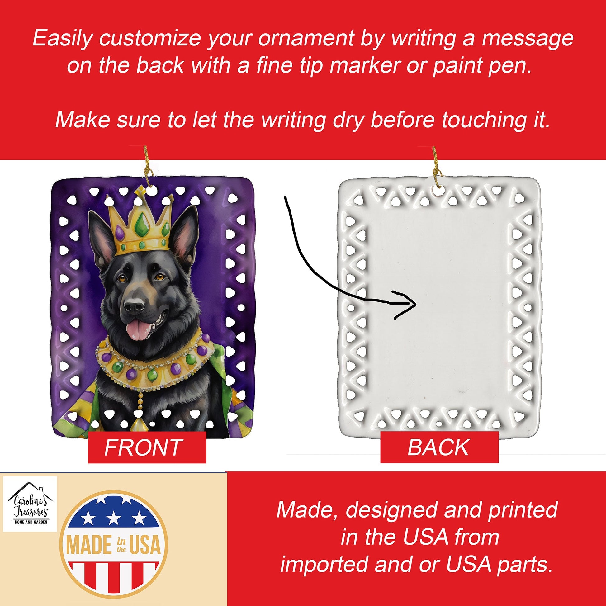 Porcelain Ornament featuring breed specific German Shepherd artwork. Celebrate Mardi Gras with this Mardi Gras Ornament. Add a unique, personal touch to your holiday decor with our Rectangular Lattice Porcelain Ornament. Perfect for creating cherished memories, this high-quality ornament shines under festive lights, reflecting warmth and joy throughout your Christmas tree. Crafted with a glossy finish, it showcases vibrant, full-color artwork contributed by our talented artists, ensuring your tree is adorned with a burst of color and holiday spirit. What sets this Porcelain Ornament apart is its customizable white back. Use a paint pen or permanent marker to write a heartfelt message, commemorate a special year, or mark an unforgettable date, turning this ornament into a keepsake that will be treasured for years to come. For best results, allow any personalization to dry thoroughly before handling. Each ornament comes complete with a delicate gold cord, making it easy to hang and display. Proudly made in the USA, this ornament measures 3.375 x 2.625 inches and is a thoughtful gift for pet sitters, teachers, family members, or anyone who would appreciate a little extra holiday magic. Bring style, charm, and a touch of personal meaning to your Christmas tree with this beautifully designed ornament..