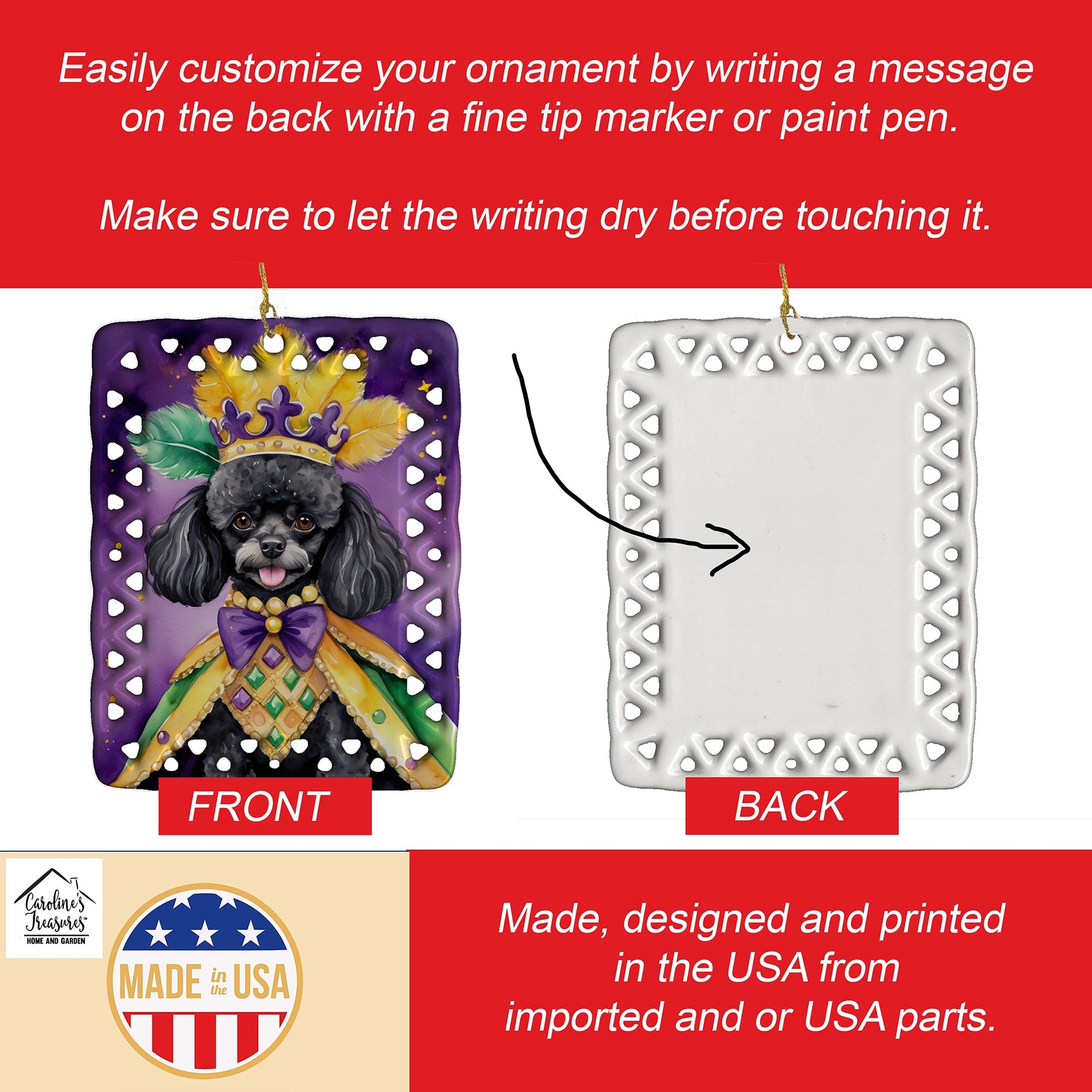 Porcelain Ornament featuring breed specific Poodle artwork. Celebrate Mardi Gras with this Mardi Gras Ornament. Add a unique, personal touch to your holiday decor with our Rectangular Lattice Porcelain Ornament. Perfect for creating cherished memories, this high-quality ornament shines under festive lights, reflecting warmth and joy throughout your Christmas tree. Crafted with a glossy finish, it showcases vibrant, full-color artwork contributed by our talented artists, ensuring your tree is adorned with a burst of color and holiday spirit. What sets this Porcelain Ornament apart is its customizable white back. Use a paint pen or permanent marker to write a heartfelt message, commemorate a special year, or mark an unforgettable date, turning this ornament into a keepsake that will be treasured for years to come. For best results, allow any personalization to dry thoroughly before handling. Each ornament comes complete with a delicate gold cord, making it easy to hang and display. Proudly made in the USA, this ornament measures 3.375 x 2.625 inches and is a thoughtful gift for pet sitters, teachers, family members, or anyone who would appreciate a little extra holiday magic. Bring style, charm, and a touch of personal meaning to your Christmas tree with this beautifully designed ornament..
