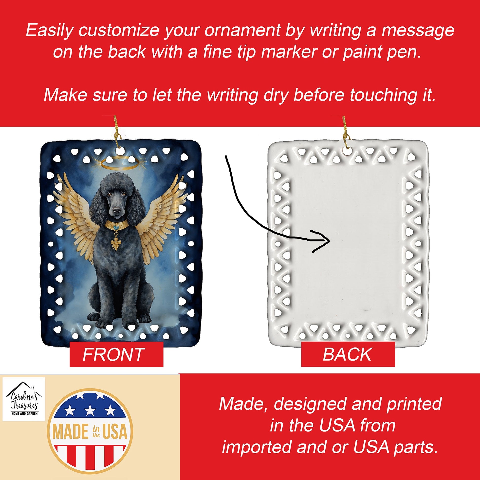 Porcelain Ornament featuring breed specific Poodle artwork. Celebrate Christmas with this Christmas Ornament. Add a unique, personal touch to your holiday decor with our Rectangular Lattice Porcelain Ornament. Perfect for creating cherished memories, this high-quality ornament shines under festive lights, reflecting warmth and joy throughout your Christmas tree. Crafted with a glossy finish, it showcases vibrant, full-color artwork contributed by our talented artists, ensuring your tree is adorned with a burst of color and holiday spirit. What sets this Porcelain Ornament apart is its customizable white back. Use a paint pen or permanent marker to write a heartfelt message, commemorate a special year, or mark an unforgettable date, turning this ornament into a keepsake that will be treasured for years to come. For best results, allow any personalization to dry thoroughly before handling. Each ornament comes complete with a delicate gold cord, making it easy to hang and display. Proudly made in the USA, this ornament measures 3.375 x 2.625 inches and is a thoughtful gift for pet sitters, teachers, family members, or anyone who would appreciate a little extra holiday magic. Bring style, charm, and a touch of personal meaning to your Christmas tree with this beautifully designed ornament..