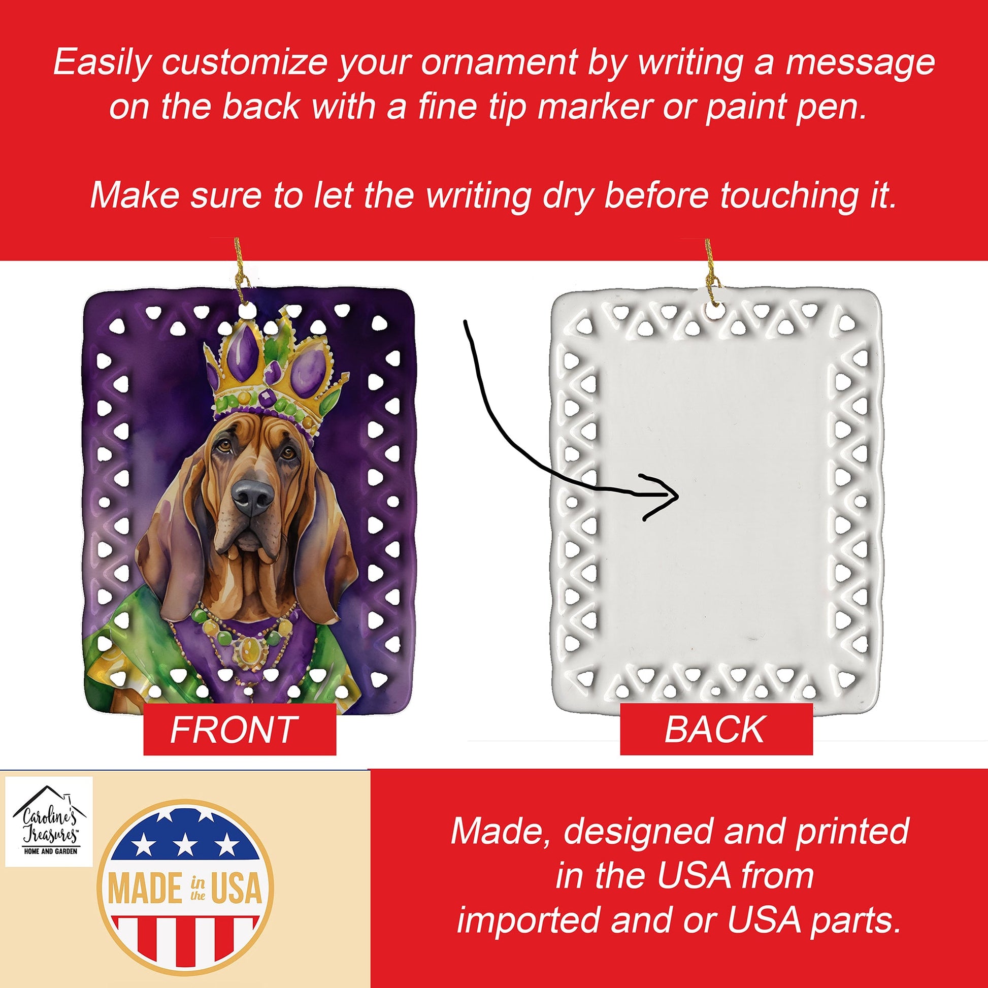 Porcelain Ornament featuring breed specific Bloodhound artwork. Celebrate Mardi Gras with this Mardi Gras Ornament. Add a unique, personal touch to your holiday decor with our Rectangular Lattice Porcelain Ornament. Perfect for creating cherished memories, this high-quality ornament shines under festive lights, reflecting warmth and joy throughout your Christmas tree. Crafted with a glossy finish, it showcases vibrant, full-color artwork contributed by our talented artists, ensuring your tree is adorned with a burst of color and holiday spirit. What sets this Porcelain Ornament apart is its customizable white back. Use a paint pen or permanent marker to write a heartfelt message, commemorate a special year, or mark an unforgettable date, turning this ornament into a keepsake that will be treasured for years to come. For best results, allow any personalization to dry thoroughly before handling. Each ornament comes complete with a delicate gold cord, making it easy to hang and display. Proudly made in the USA, this ornament measures 3.375 x 2.625 inches and is a thoughtful gift for pet sitters, teachers, family members, or anyone who would appreciate a little extra holiday magic. Bring style, charm, and a touch of personal meaning to your Christmas tree with this beautifully designed ornament..