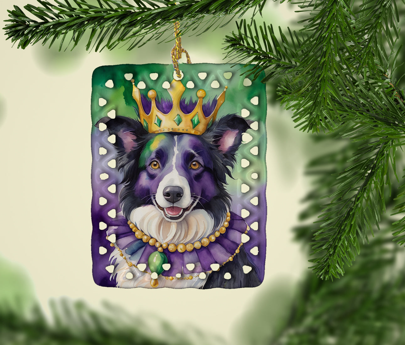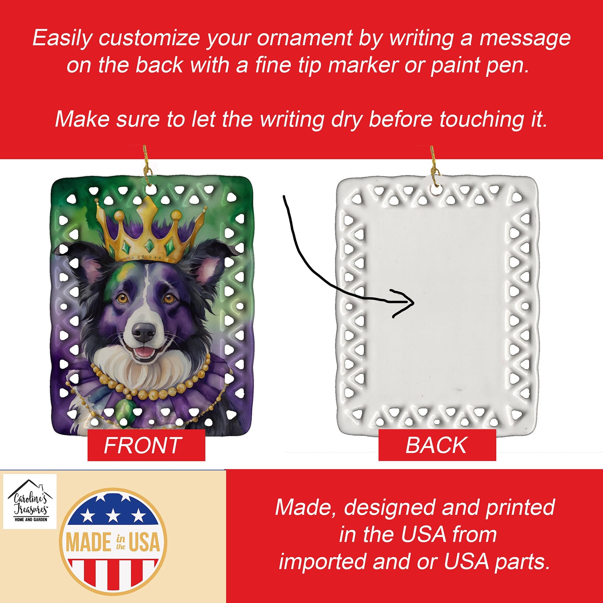 Porcelain Ornament featuring breed specific Border Collie artwork. Celebrate Mardi Gras with this Mardi Gras Ornament. Add a unique, personal touch to your holiday decor with our Rectangular Lattice Porcelain Ornament. Perfect for creating cherished memories, this high-quality ornament shines under festive lights, reflecting warmth and joy throughout your Christmas tree. Crafted with a glossy finish, it showcases vibrant, full-color artwork contributed by our talented artists, ensuring your tree is adorned with a burst of color and holiday spirit. What sets this Porcelain Ornament apart is its customizable white back. Use a paint pen or permanent marker to write a heartfelt message, commemorate a special year, or mark an unforgettable date, turning this ornament into a keepsake that will be treasured for years to come. For best results, allow any personalization to dry thoroughly before handling. Each ornament comes complete with a delicate gold cord, making it easy to hang and display. Proudly made in the USA, this ornament measures 3.375 x 2.625 inches and is a thoughtful gift for pet sitters, teachers, family members, or anyone who would appreciate a little extra holiday magic. Bring style, charm, and a touch of personal meaning to your Christmas tree with this beautifully designed ornament..