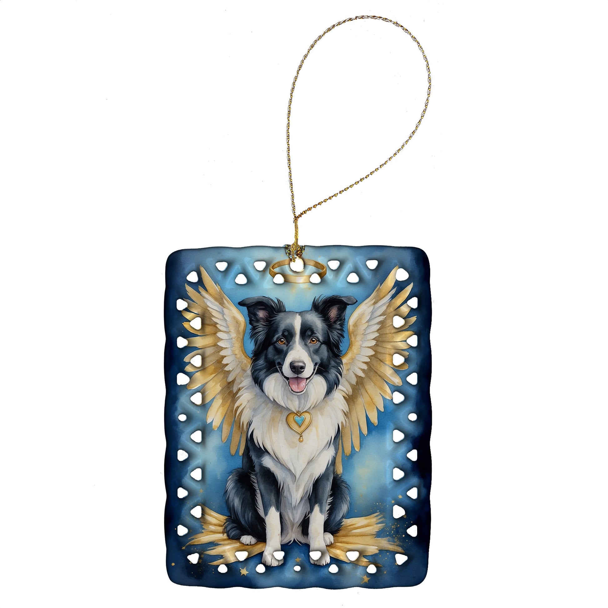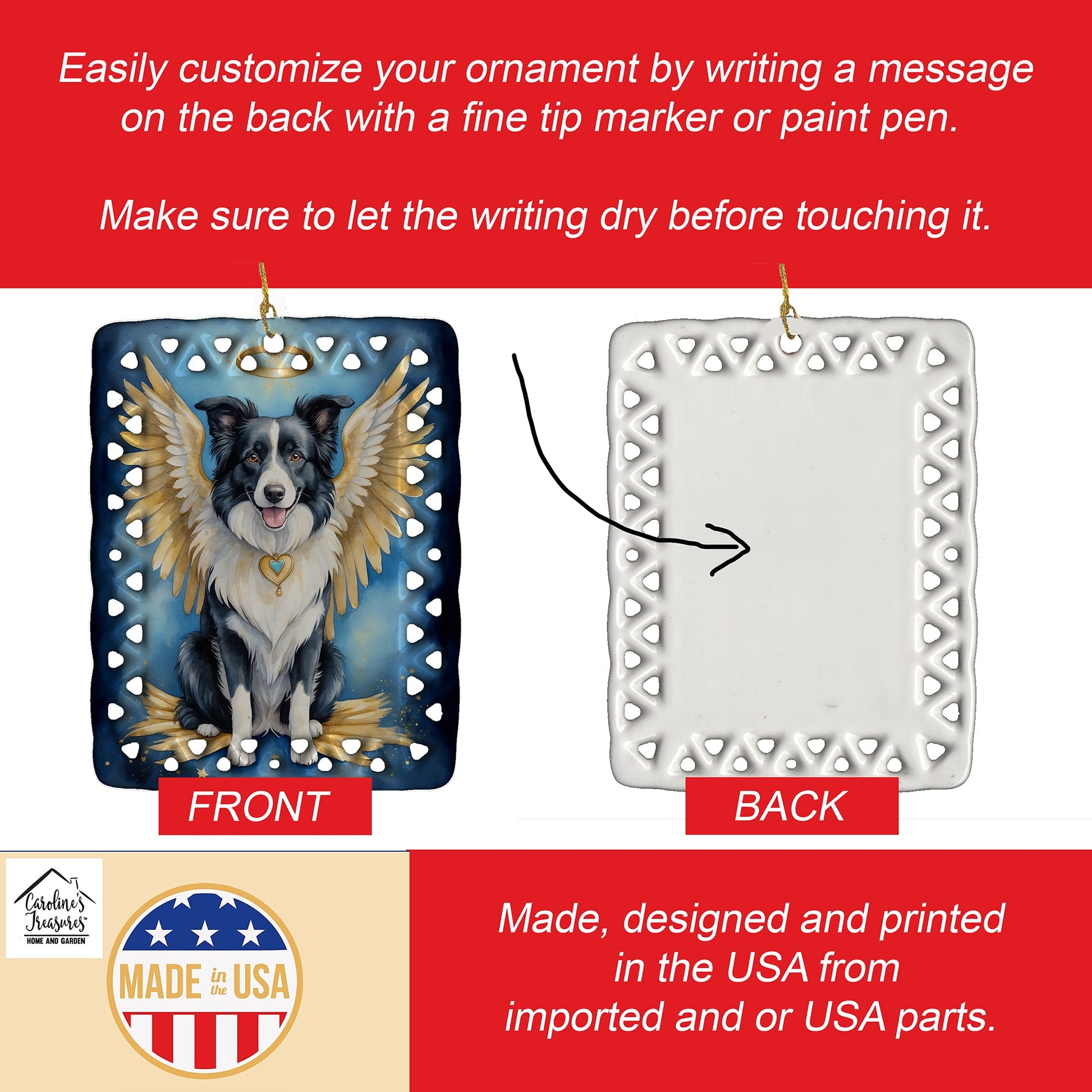 Porcelain Ornament featuring breed specific Border Collie artwork. Celebrate Christmas with this Christmas Ornament. Add a unique, personal touch to your holiday decor with our Rectangular Lattice Porcelain Ornament. Perfect for creating cherished memories, this high-quality ornament shines under festive lights, reflecting warmth and joy throughout your Christmas tree. Crafted with a glossy finish, it showcases vibrant, full-color artwork contributed by our talented artists, ensuring your tree is adorned with a burst of color and holiday spirit. What sets this Porcelain Ornament apart is its customizable white back. Use a paint pen or permanent marker to write a heartfelt message, commemorate a special year, or mark an unforgettable date, turning this ornament into a keepsake that will be treasured for years to come. For best results, allow any personalization to dry thoroughly before handling. Each ornament comes complete with a delicate gold cord, making it easy to hang and display. Proudly made in the USA, this ornament measures 3.375 x 2.625 inches and is a thoughtful gift for pet sitters, teachers, family members, or anyone who would appreciate a little extra holiday magic. Bring style, charm, and a touch of personal meaning to your Christmas tree with this beautifully designed ornament..