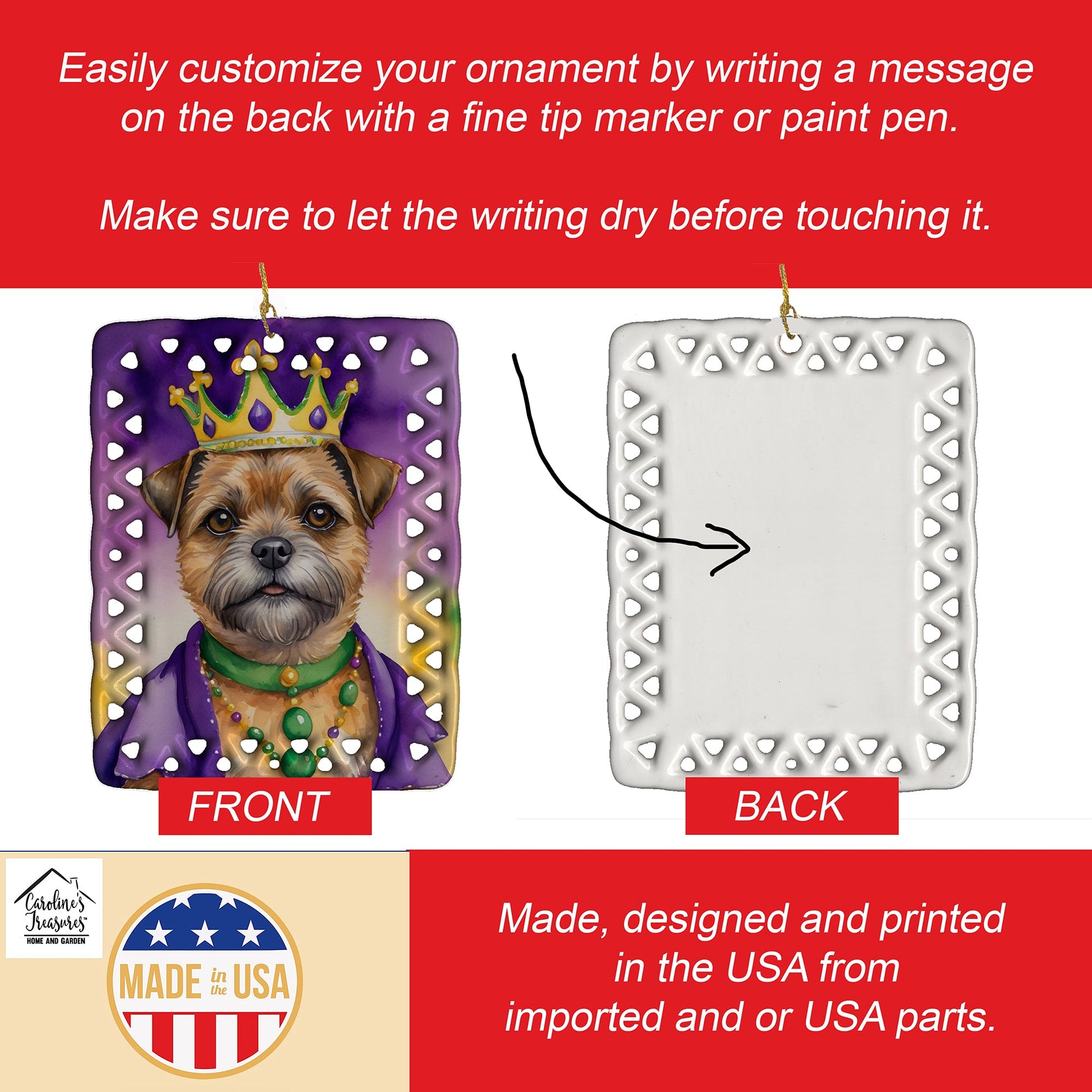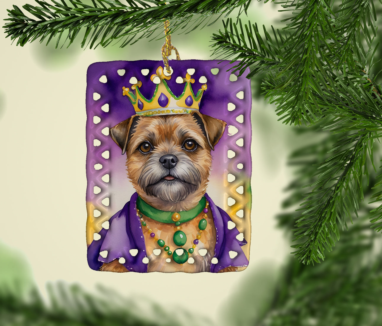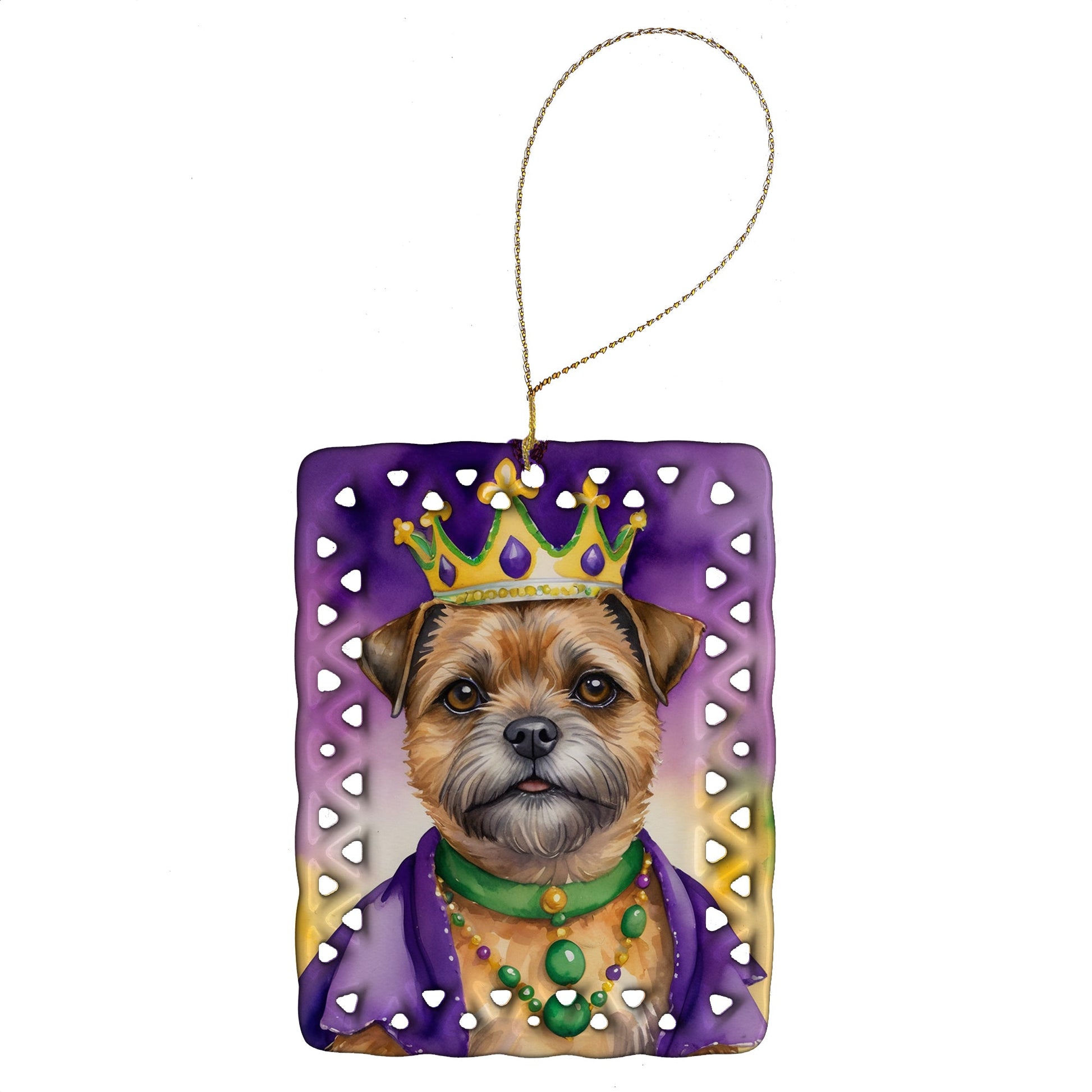 Porcelain Ornament featuring breed specific Border Terrier artwork. Celebrate Mardi Gras with this Mardi Gras Ornament. Add a unique, personal touch to your holiday decor with our Rectangular Lattice Porcelain Ornament. Perfect for creating cherished memories, this high-quality ornament shines under festive lights, reflecting warmth and joy throughout your Christmas tree. Crafted with a glossy finish, it showcases vibrant, full-color artwork contributed by our talented artists, ensuring your tree is adorned with a burst of color and holiday spirit. What sets this Porcelain Ornament apart is its customizable white back. Use a paint pen or permanent marker to write a heartfelt message, commemorate a special year, or mark an unforgettable date, turning this ornament into a keepsake that will be treasured for years to come. For best results, allow any personalization to dry thoroughly before handling. Each ornament comes complete with a delicate gold cord, making it easy to hang and display. Proudly made in the USA, this ornament measures 3.375 x 2.625 inches and is a thoughtful gift for pet sitters, teachers, family members, or anyone who would appreciate a little extra holiday magic. Bring style, charm, and a touch of personal meaning to your Christmas tree with this beautifully designed ornament..
