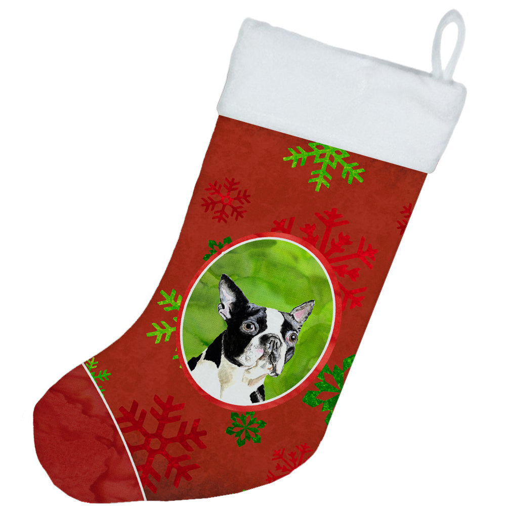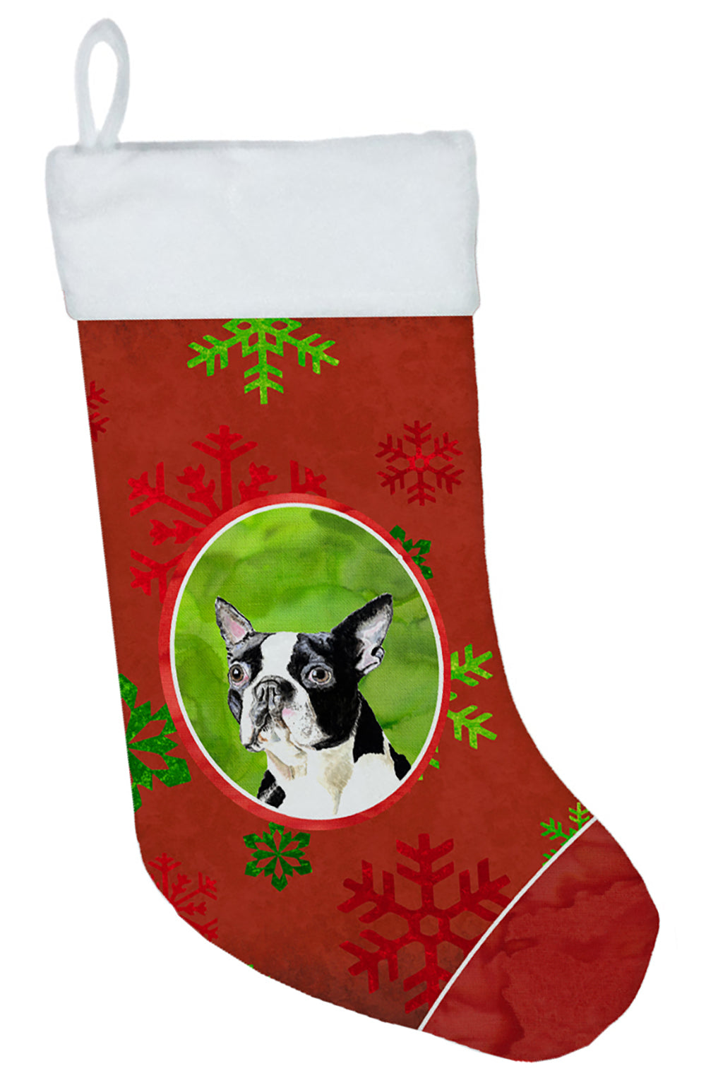 Boston Terrier Red and Green Snowflakes Holiday Christmas Stocking