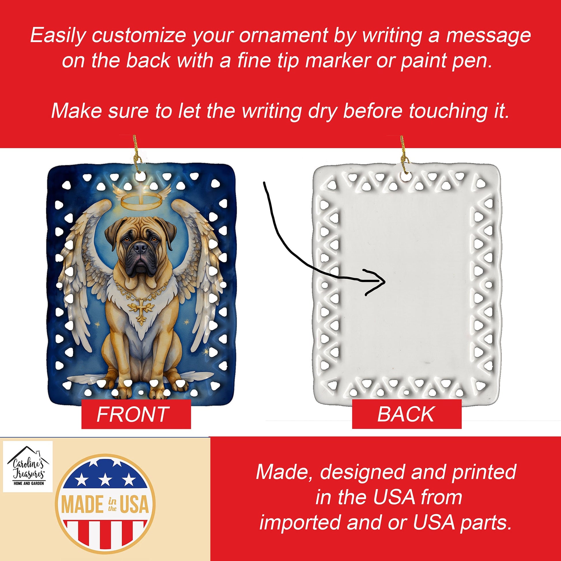 Porcelain Ornament featuring breed specific Bullmastiff artwork. Celebrate Christmas with this Christmas Ornament. Add a unique, personal touch to your holiday decor with our Rectangular Lattice Porcelain Ornament. Perfect for creating cherished memories, this high-quality ornament shines under festive lights, reflecting warmth and joy throughout your Christmas tree. Crafted with a glossy finish, it showcases vibrant, full-color artwork contributed by our talented artists, ensuring your tree is adorned with a burst of color and holiday spirit. What sets this Porcelain Ornament apart is its customizable white back. Use a paint pen or permanent marker to write a heartfelt message, commemorate a special year, or mark an unforgettable date, turning this ornament into a keepsake that will be treasured for years to come. For best results, allow any personalization to dry thoroughly before handling. Each ornament comes complete with a delicate gold cord, making it easy to hang and display. Proudly made in the USA, this ornament measures 3.375 x 2.625 inches and is a thoughtful gift for pet sitters, teachers, family members, or anyone who would appreciate a little extra holiday magic. Bring style, charm, and a touch of personal meaning to your Christmas tree with this beautifully designed ornament..
