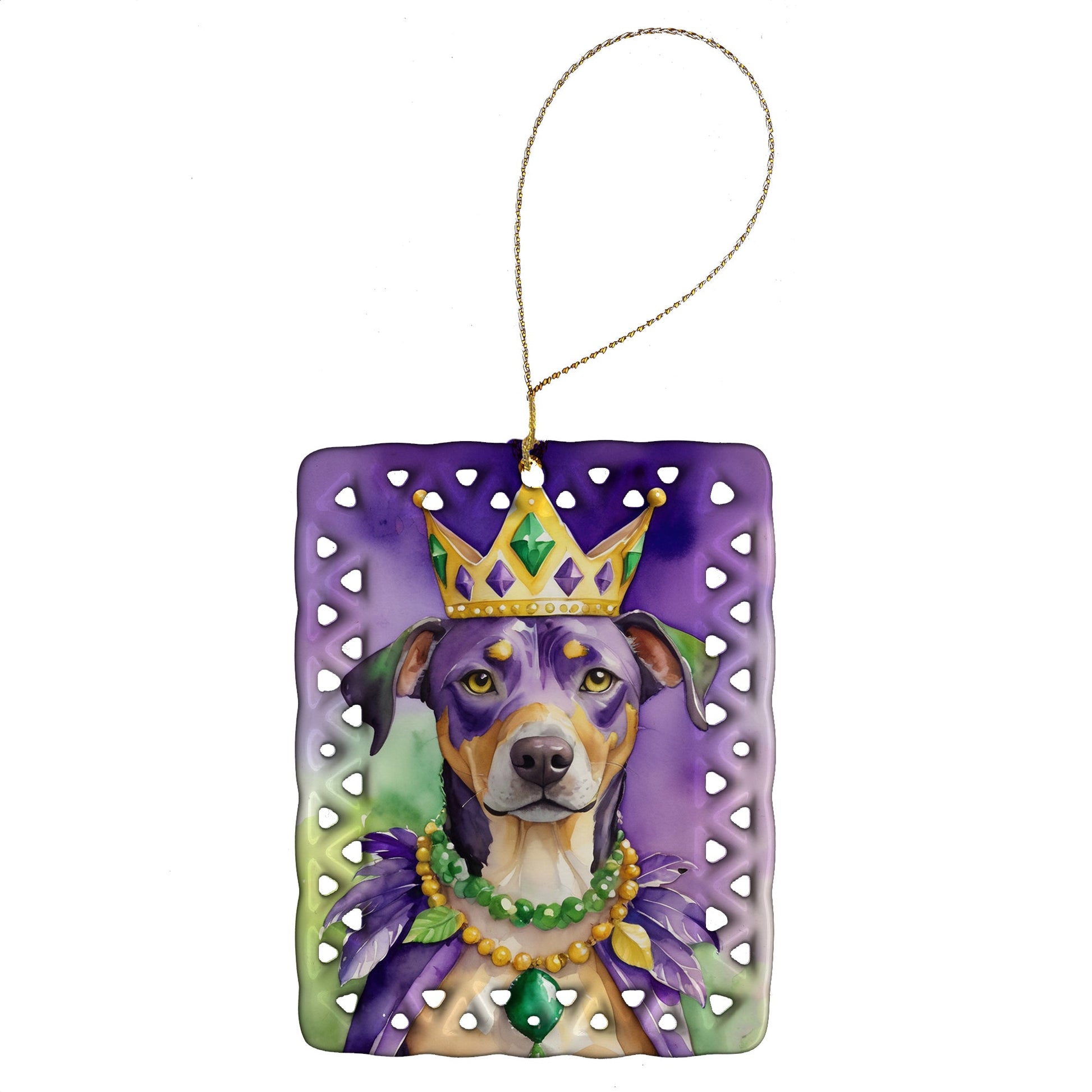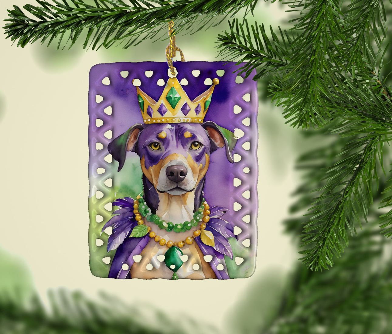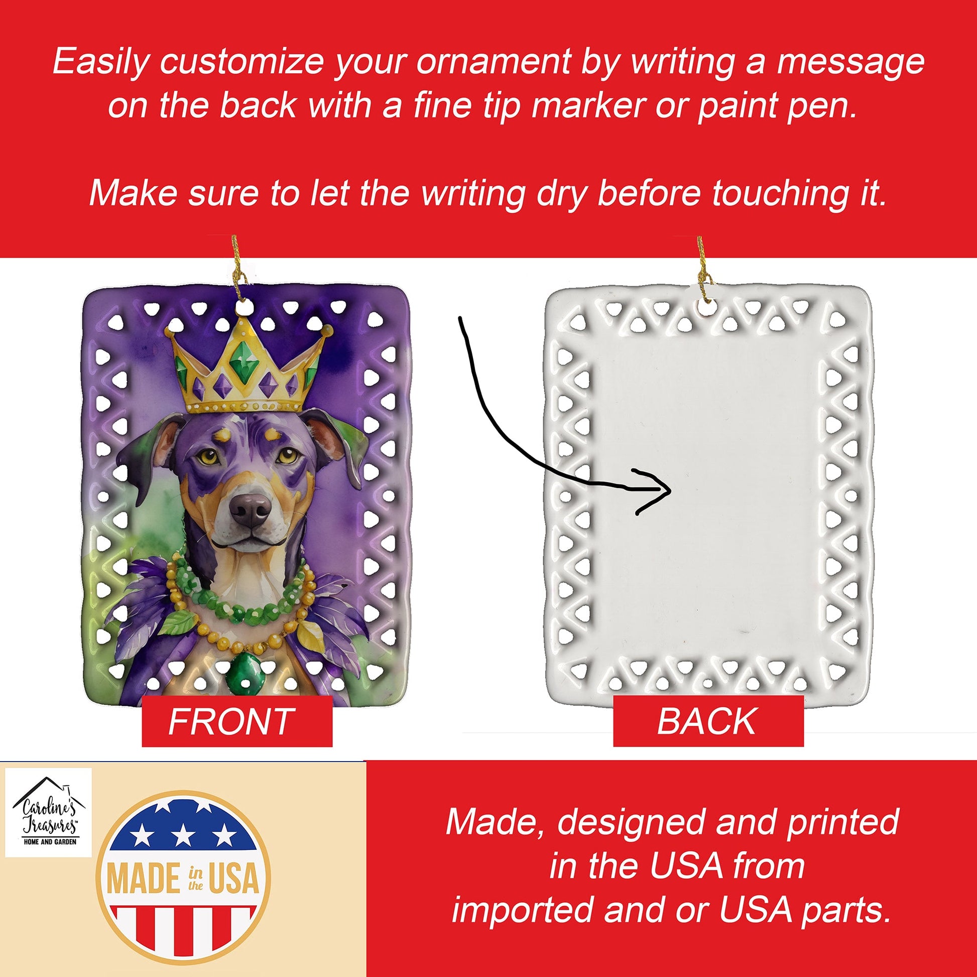 Porcelain Ornament featuring breed specific Catahoula artwork. Celebrate Mardi Gras with this Mardi Gras Ornament. Add a unique, personal touch to your holiday decor with our Rectangular Lattice Porcelain Ornament. Perfect for creating cherished memories, this high-quality ornament shines under festive lights, reflecting warmth and joy throughout your Christmas tree. Crafted with a glossy finish, it showcases vibrant, full-color artwork contributed by our talented artists, ensuring your tree is adorned with a burst of color and holiday spirit. What sets this Porcelain Ornament apart is its customizable white back. Use a paint pen or permanent marker to write a heartfelt message, commemorate a special year, or mark an unforgettable date, turning this ornament into a keepsake that will be treasured for years to come. For best results, allow any personalization to dry thoroughly before handling. Each ornament comes complete with a delicate gold cord, making it easy to hang and display. Proudly made in the USA, this ornament measures 3.375 x 2.625 inches and is a thoughtful gift for pet sitters, teachers, family members, or anyone who would appreciate a little extra holiday magic. Bring style, charm, and a touch of personal meaning to your Christmas tree with this beautifully designed ornament..