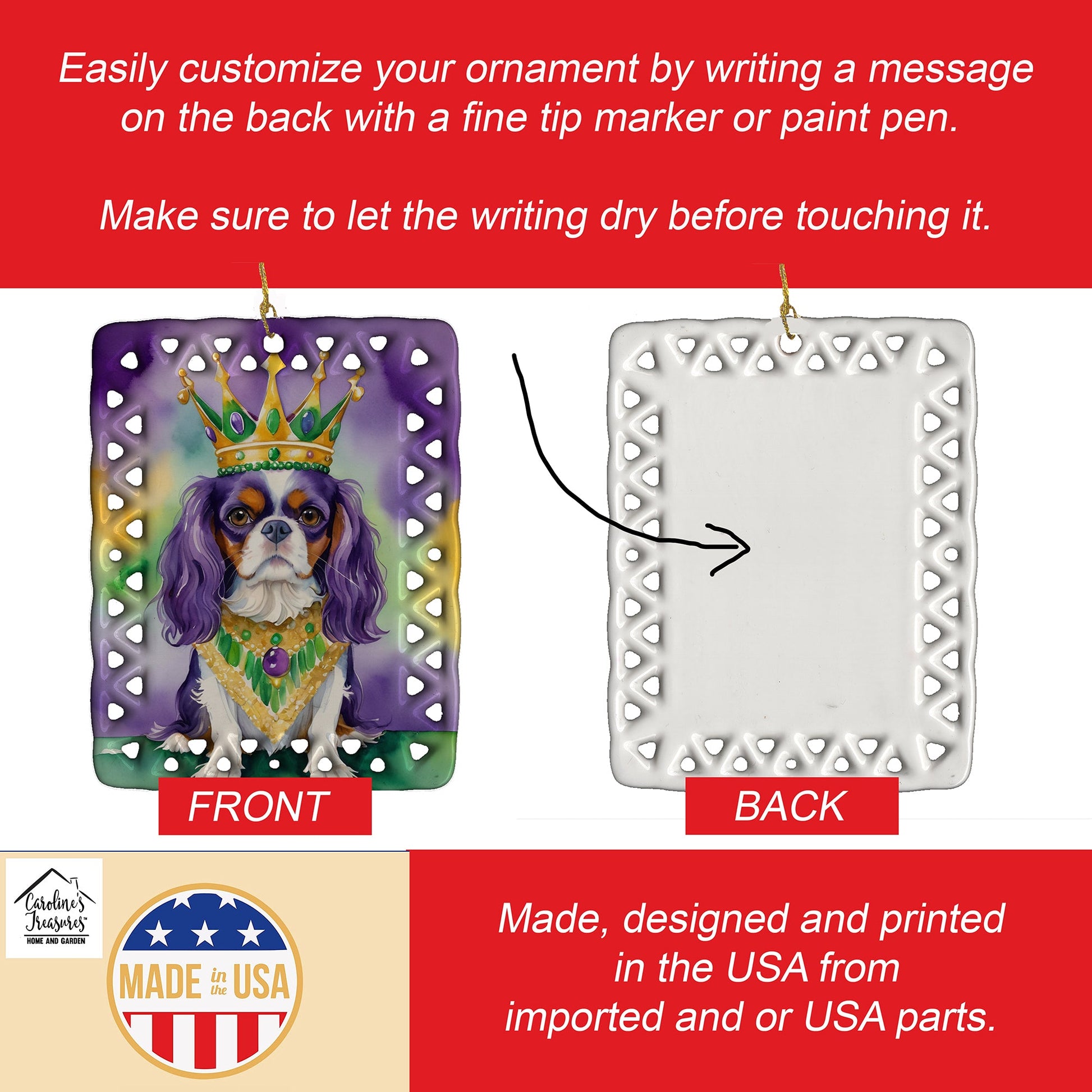 Porcelain Ornament featuring breed specific Cavalier King Charles Spaniel artwork. Celebrate Mardi Gras with this Mardi Gras Ornament. Add a unique, personal touch to your holiday decor with our Rectangular Lattice Porcelain Ornament. Perfect for creating cherished memories, this high-quality ornament shines under festive lights, reflecting warmth and joy throughout your Christmas tree. Crafted with a glossy finish, it showcases vibrant, full-color artwork contributed by our talented artists, ensuring your tree is adorned with a burst of color and holiday spirit. What sets this Porcelain Ornament apart is its customizable white back. Use a paint pen or permanent marker to write a heartfelt message, commemorate a special year, or mark an unforgettable date, turning this ornament into a keepsake that will be treasured for years to come. For best results, allow any personalization to dry thoroughly before handling. Each ornament comes complete with a delicate gold cord, making it easy to hang and display. Proudly made in the USA, this ornament measures 3.375 x 2.625 inches and is a thoughtful gift for pet sitters, teachers, family members, or anyone who would appreciate a little extra holiday magic. Bring style, charm, and a touch of personal meaning to your Christmas tree with this beautifully designed ornament..