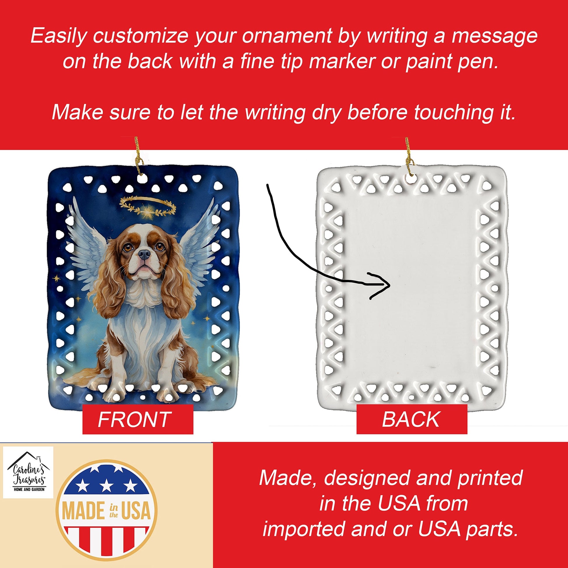 Porcelain Ornament featuring breed specific Cavalier King Charles Spaniel artwork. Celebrate Christmas with this Christmas Ornament. Add a unique, personal touch to your holiday decor with our Rectangular Lattice Porcelain Ornament. Perfect for creating cherished memories, this high-quality ornament shines under festive lights, reflecting warmth and joy throughout your Christmas tree. Crafted with a glossy finish, it showcases vibrant, full-color artwork contributed by our talented artists, ensuring your tree is adorned with a burst of color and holiday spirit. What sets this Porcelain Ornament apart is its customizable white back. Use a paint pen or permanent marker to write a heartfelt message, commemorate a special year, or mark an unforgettable date, turning this ornament into a keepsake that will be treasured for years to come. For best results, allow any personalization to dry thoroughly before handling. Each ornament comes complete with a delicate gold cord, making it easy to hang and display. Proudly made in the USA, this ornament measures 3.375 x 2.625 inches and is a thoughtful gift for pet sitters, teachers, family members, or anyone who would appreciate a little extra holiday magic. Bring style, charm, and a touch of personal meaning to your Christmas tree with this beautifully designed ornament..