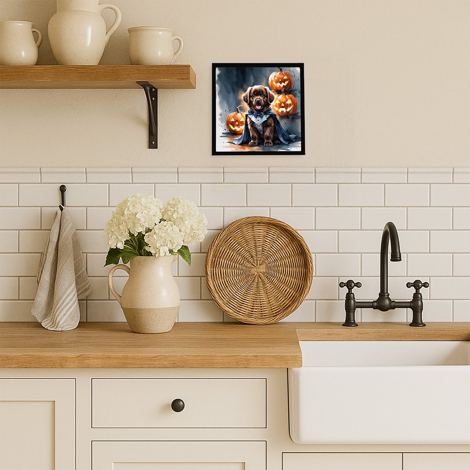 Framed Metal Print featuring breed specific Newfoundland artwork. Celebrate Halloween with this Halloween Framed Metal Print. Looking for wall art that’s stylish, safe, and made to last? Our 8x8 Framed Metal Prints are designed with modern living in mind. Each piece features original artwork printed on durable aluminum, set in a sleek frame that measures 3/4 inch deep for a clean, contemporary finish. Unlike glass prints, these are lightweight, shatter-free, and family-safe. Perfect for kitchens, bathrooms, or covered porches where traditional décor might not hold up. The built-in sawtooth hanger molded into the back makes it easy to hang right out of the box—just use your own nails or screws. Cleaning is simple too: a quick wipe with a damp cloth and mild soap keeps your artwork looking vibrant. Proudly made in Alabama, every print supports our community of artists while adding personality and charm to your home.