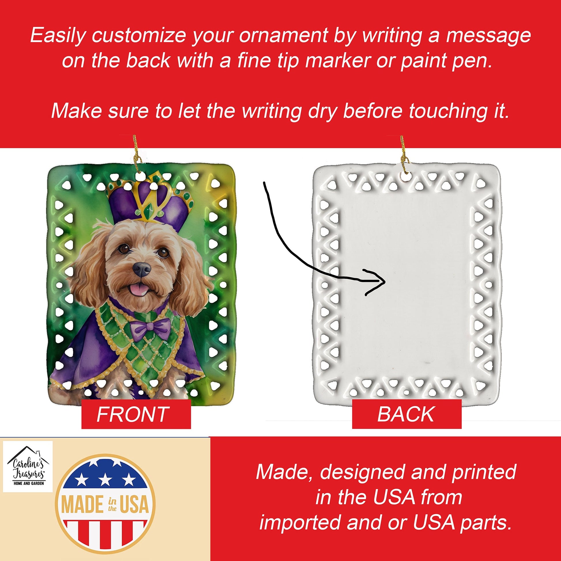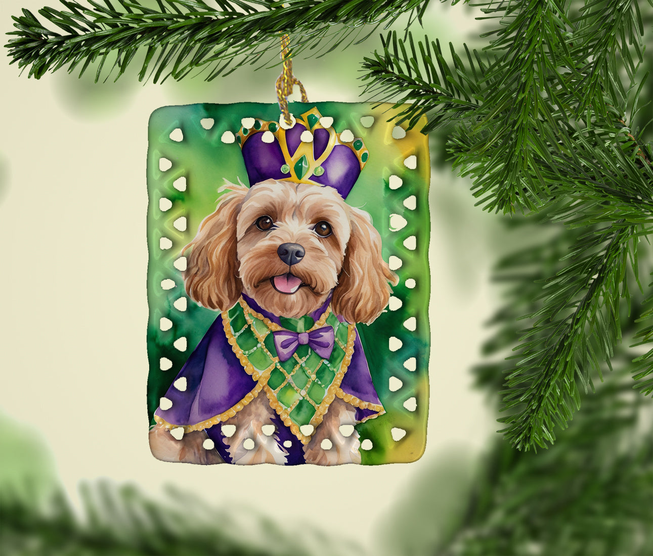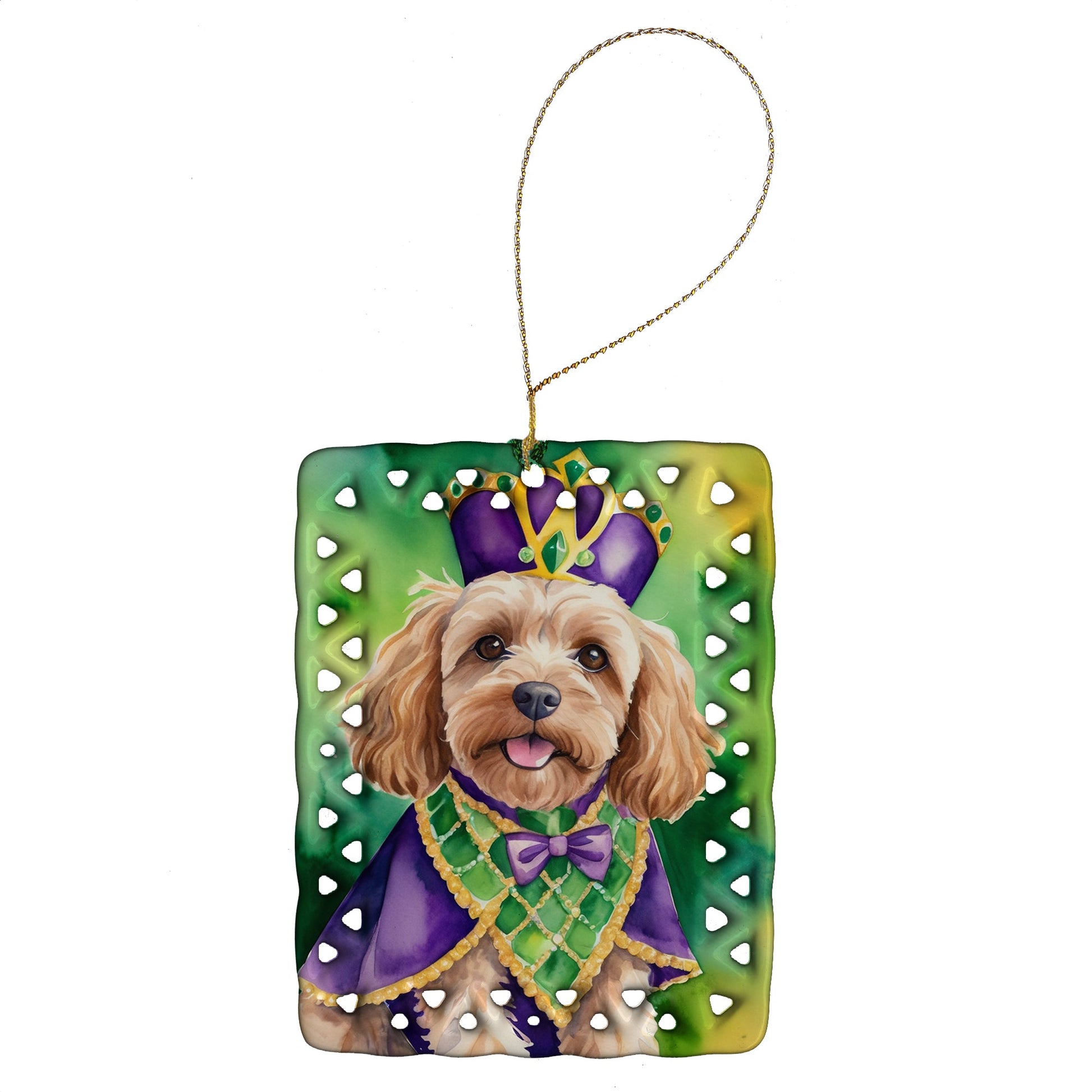 Porcelain Ornament featuring breed specific Cockapoo artwork. Celebrate Mardi Gras with this Mardi Gras Ornament. Add a unique, personal touch to your holiday decor with our Rectangular Lattice Porcelain Ornament. Perfect for creating cherished memories, this high-quality ornament shines under festive lights, reflecting warmth and joy throughout your Christmas tree. Crafted with a glossy finish, it showcases vibrant, full-color artwork contributed by our talented artists, ensuring your tree is adorned with a burst of color and holiday spirit. What sets this Porcelain Ornament apart is its customizable white back. Use a paint pen or permanent marker to write a heartfelt message, commemorate a special year, or mark an unforgettable date, turning this ornament into a keepsake that will be treasured for years to come. For best results, allow any personalization to dry thoroughly before handling. Each ornament comes complete with a delicate gold cord, making it easy to hang and display. Proudly made in the USA, this ornament measures 3.375 x 2.625 inches and is a thoughtful gift for pet sitters, teachers, family members, or anyone who would appreciate a little extra holiday magic. Bring style, charm, and a touch of personal meaning to your Christmas tree with this beautifully designed ornament..