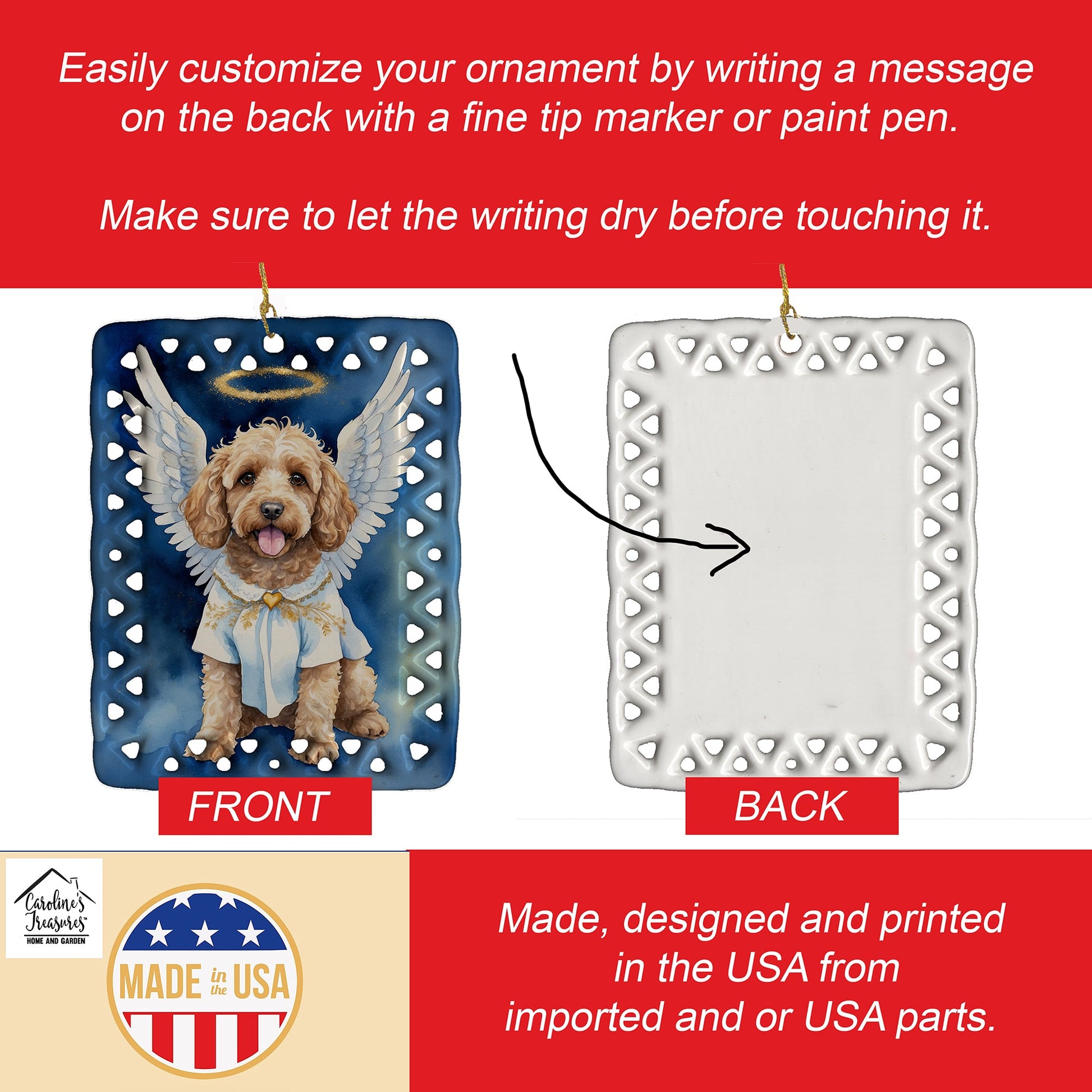 Porcelain Ornament featuring breed specific Cockapoo artwork. Celebrate Christmas with this Christmas Ornament. Add a unique, personal touch to your holiday decor with our Rectangular Lattice Porcelain Ornament. Perfect for creating cherished memories, this high-quality ornament shines under festive lights, reflecting warmth and joy throughout your Christmas tree. Crafted with a glossy finish, it showcases vibrant, full-color artwork contributed by our talented artists, ensuring your tree is adorned with a burst of color and holiday spirit. What sets this Porcelain Ornament apart is its customizable white back. Use a paint pen or permanent marker to write a heartfelt message, commemorate a special year, or mark an unforgettable date, turning this ornament into a keepsake that will be treasured for years to come. For best results, allow any personalization to dry thoroughly before handling. Each ornament comes complete with a delicate gold cord, making it easy to hang and display. Proudly made in the USA, this ornament measures 3.375 x 2.625 inches and is a thoughtful gift for pet sitters, teachers, family members, or anyone who would appreciate a little extra holiday magic. Bring style, charm, and a touch of personal meaning to your Christmas tree with this beautifully designed ornament..