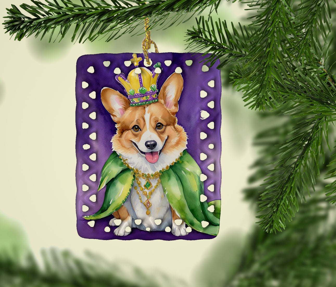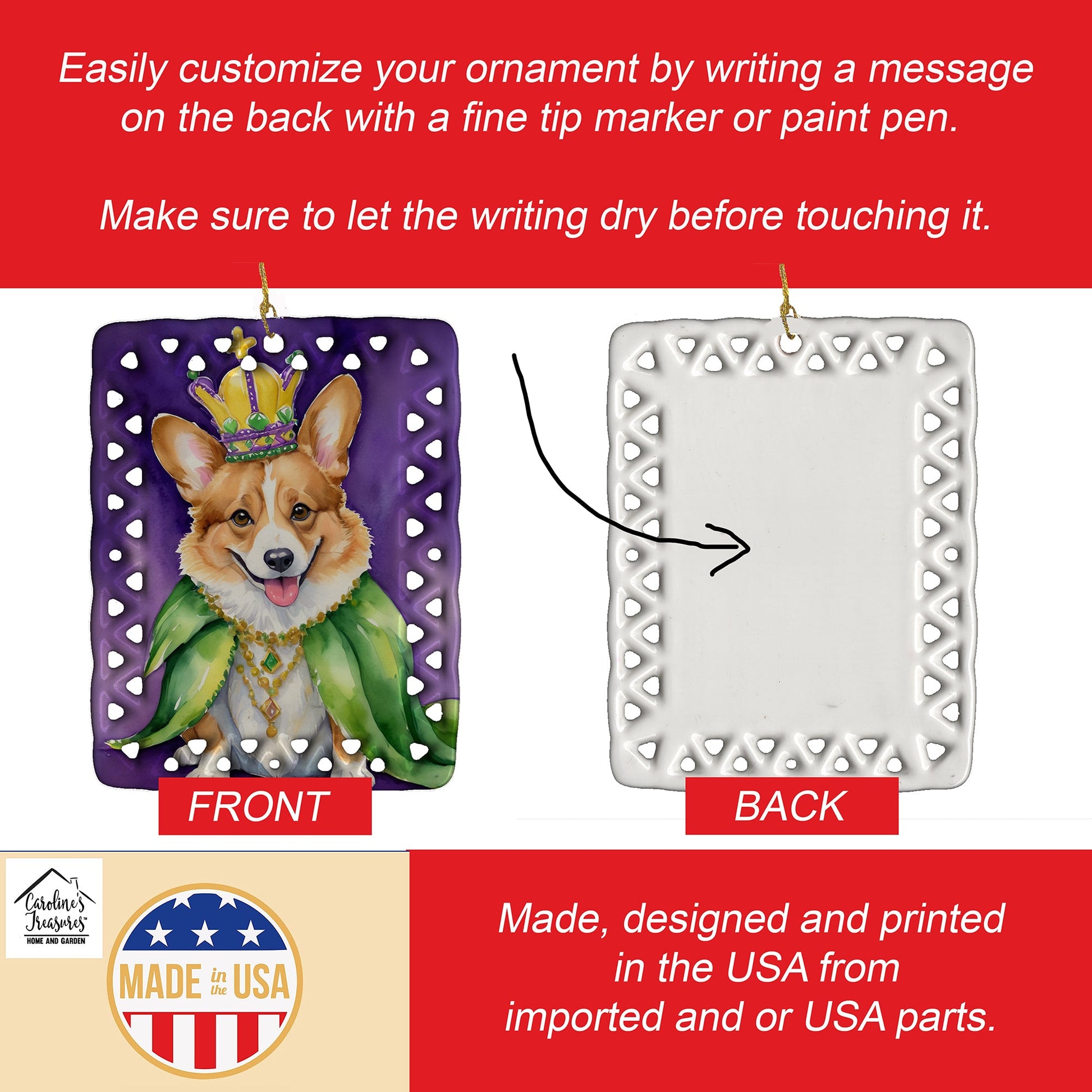 Porcelain Ornament featuring breed specific Corgi artwork. Celebrate Mardi Gras with this Mardi Gras Ornament. Add a unique, personal touch to your holiday decor with our Rectangular Lattice Porcelain Ornament. Perfect for creating cherished memories, this high-quality ornament shines under festive lights, reflecting warmth and joy throughout your Christmas tree. Crafted with a glossy finish, it showcases vibrant, full-color artwork contributed by our talented artists, ensuring your tree is adorned with a burst of color and holiday spirit. What sets this Porcelain Ornament apart is its customizable white back. Use a paint pen or permanent marker to write a heartfelt message, commemorate a special year, or mark an unforgettable date, turning this ornament into a keepsake that will be treasured for years to come. For best results, allow any personalization to dry thoroughly before handling. Each ornament comes complete with a delicate gold cord, making it easy to hang and display. Proudly made in the USA, this ornament measures 3.375 x 2.625 inches and is a thoughtful gift for pet sitters, teachers, family members, or anyone who would appreciate a little extra holiday magic. Bring style, charm, and a touch of personal meaning to your Christmas tree with this beautifully designed ornament..