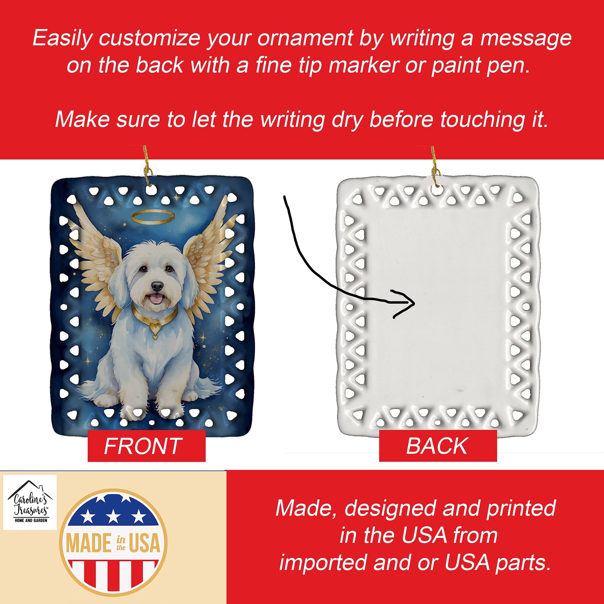 Porcelain Ornament featuring breed specific Coton de Tulear artwork. Celebrate Christmas with this Christmas Ornament. Add a unique, personal touch to your holiday decor with our Rectangular Lattice Porcelain Ornament. Perfect for creating cherished memories, this high-quality ornament shines under festive lights, reflecting warmth and joy throughout your Christmas tree. Crafted with a glossy finish, it showcases vibrant, full-color artwork contributed by our talented artists, ensuring your tree is adorned with a burst of color and holiday spirit. What sets this Porcelain Ornament apart is its customizable white back. Use a paint pen or permanent marker to write a heartfelt message, commemorate a special year, or mark an unforgettable date, turning this ornament into a keepsake that will be treasured for years to come. For best results, allow any personalization to dry thoroughly before handling. Each ornament comes complete with a delicate gold cord, making it easy to hang and display. Proudly made in the USA, this ornament measures 3.375 x 2.625 inches and is a thoughtful gift for pet sitters, teachers, family members, or anyone who would appreciate a little extra holiday magic. Bring style, charm, and a touch of personal meaning to your Christmas tree with this beautifully designed ornament..